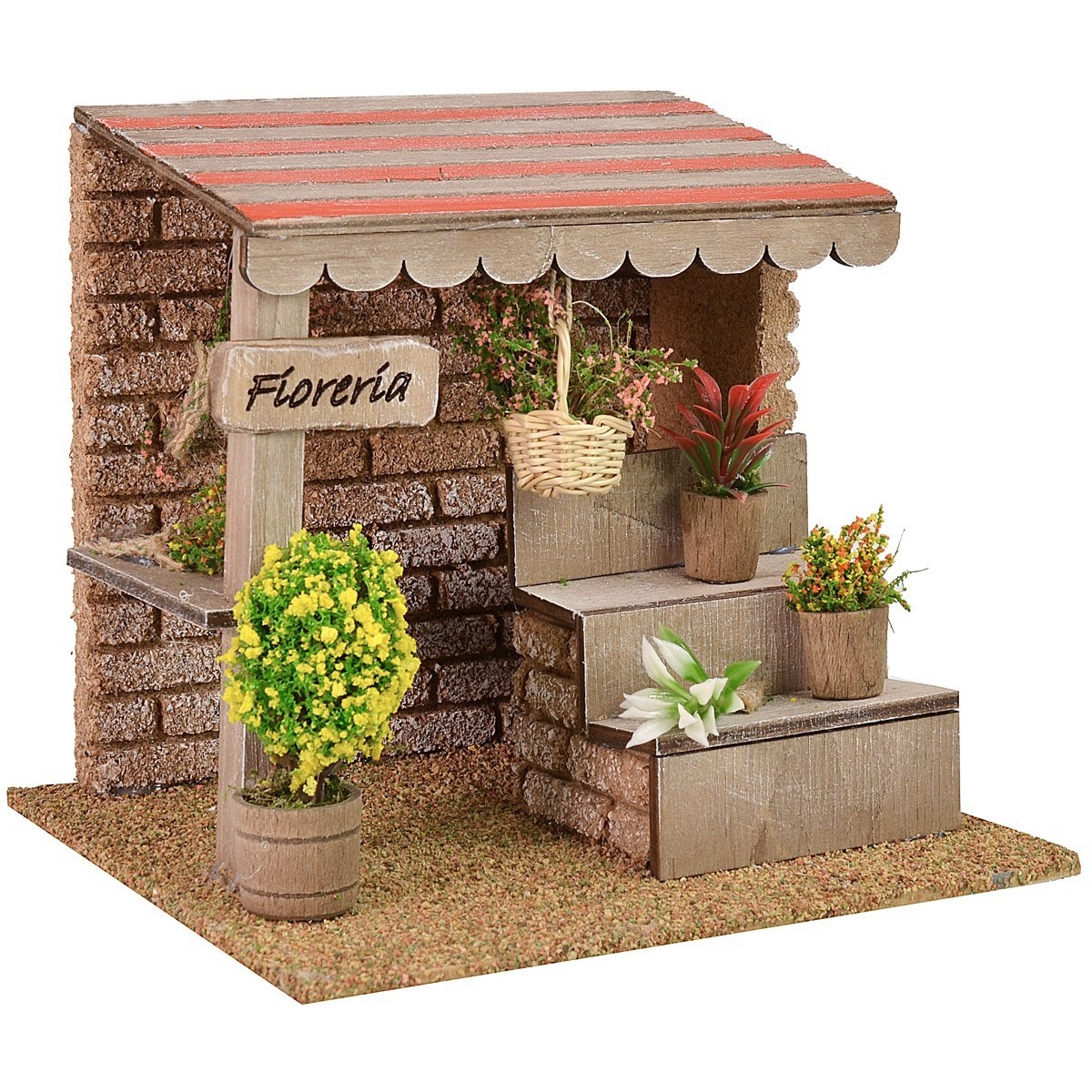 Scenografia per Presepe che riproduce realisticamente la bottega di un fiorista coperta da una tenda parasole a righe e con vasi di fiori colorati esposti ordinatamente. L' ambientazione è rifinita nei minimi dettagli con un vaso appeso al centro. L'articolo è consigliato per statue di altezza 8-10 cm ed è stato prodotto artigianalmente in Italia con legno sughero e muschio.
