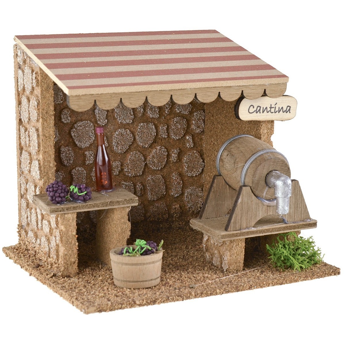 Osteria di un vignaio dov' è presente un tavolo con sopra dell' uva e una bottiglia, una tinozza in legno colma d'uva nera ed una botte con rubinetto da cui spillare il vino. L'articolo è adatto a statue per presepe di altezza 8-10 cm ed è stato prodotto artigianalmente in Italia con legno e sughero.
