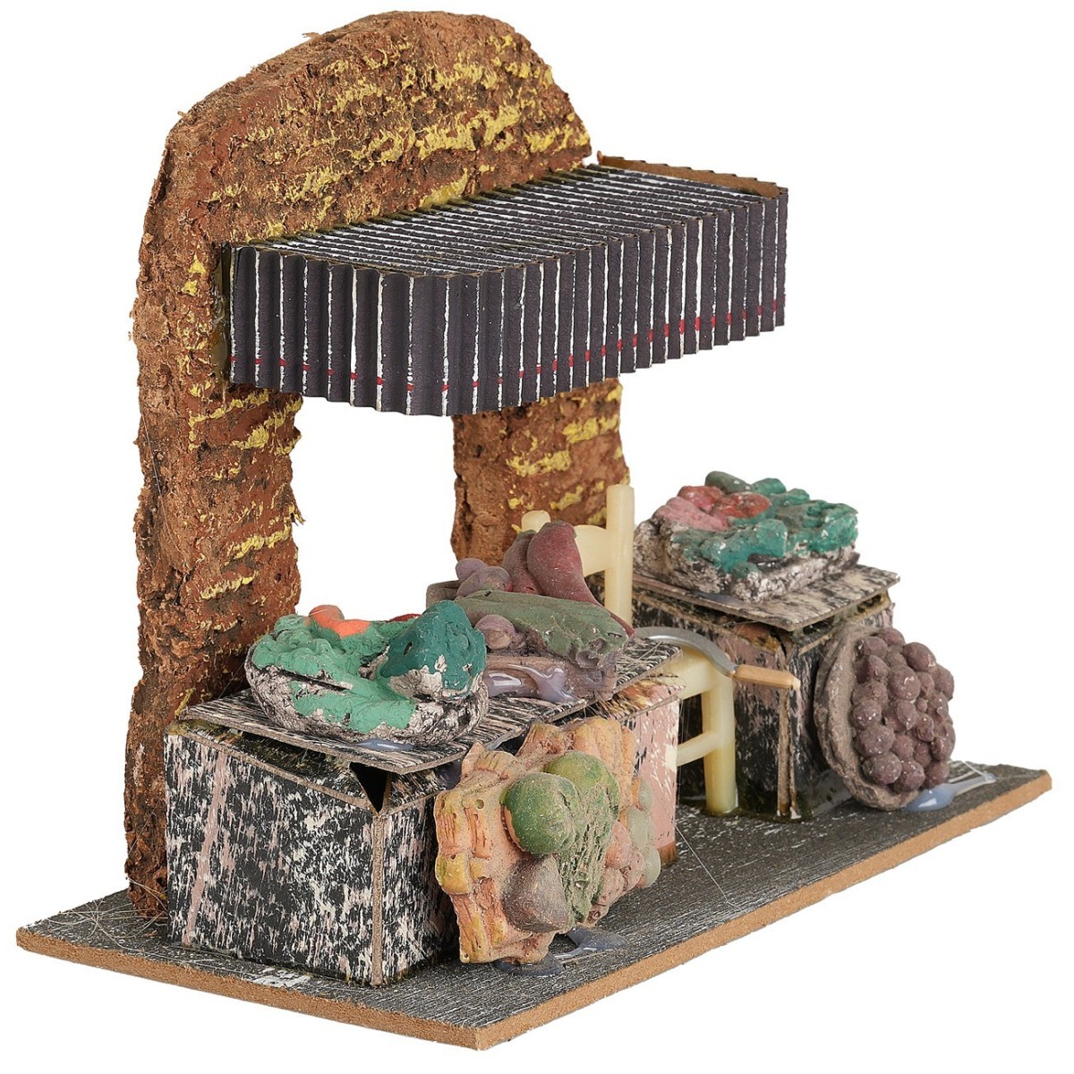 Fruit and vegetable vendor setting with arch and canopy. The scene features stalls of vegetables and fresh fruit. The product is made of resin. It is recommended to use with statues of 8-10 cm in height, (for further specifications, go to the product details section). Please note that as this is a handmade product, some details of the small parts may vary from the photos.