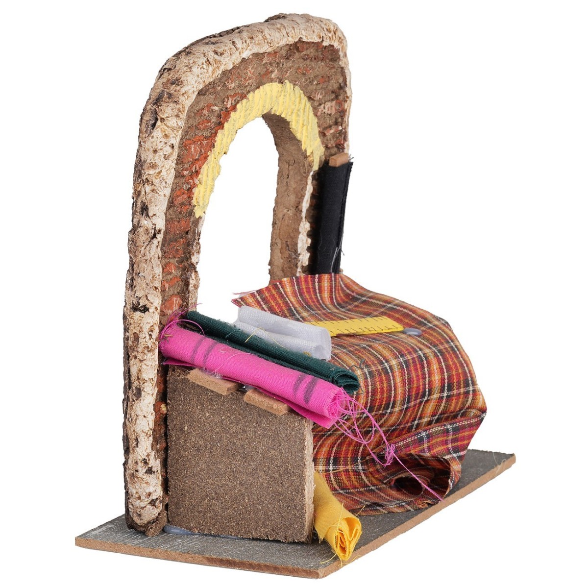 Bottega del tapezziere con arco. Questa scena rappresenta una bottega con una bancarella colma di stoffe. Il prodotto è realizzato in resina, ed è consigliato per statue di altezza 10 cm. Essendo un prodotto artigianale, alcuni dettagli delle minuterie possono variare rispetto alle foto.