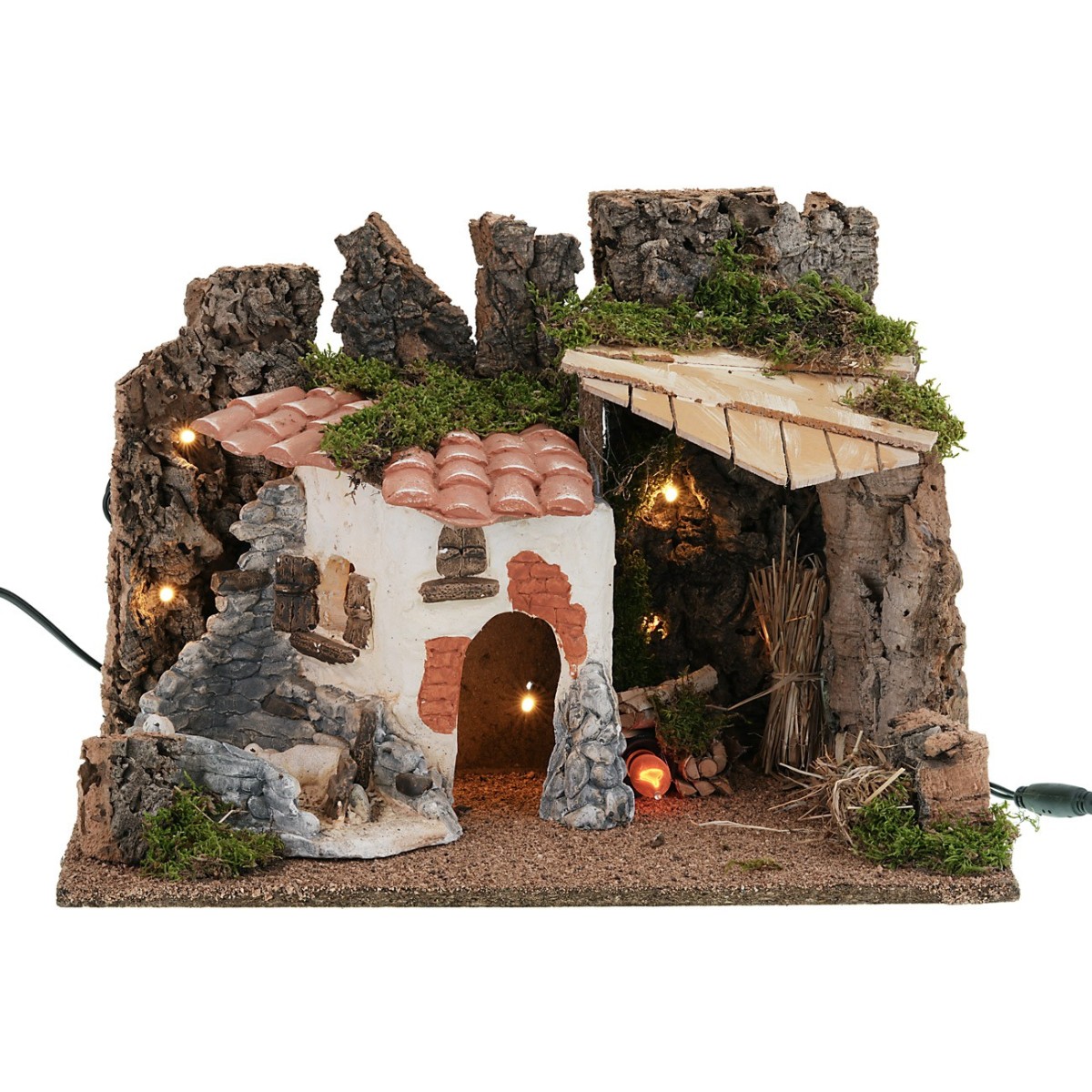 Countryside setting consisting of a central farmhouse with an open arched door and a window overlooking the sheepfold adjacent to the house. On the right side, there is a storage room protected by a wooden roof, and inside we can see a fire powered by electricity with a flickering flame effect. The product is handcrafted by Italian artisans using wood, cork, and moss and is recommended for figurines 8-10 cm in height.