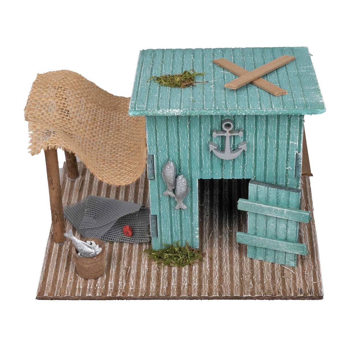 Fisherman's hut in aqua green tones, handcrafted using wood, cork, and moss, perfect for figurines 6 to 8 cm tall. This piece recreates an ideal maritime environment for your nativity scene.