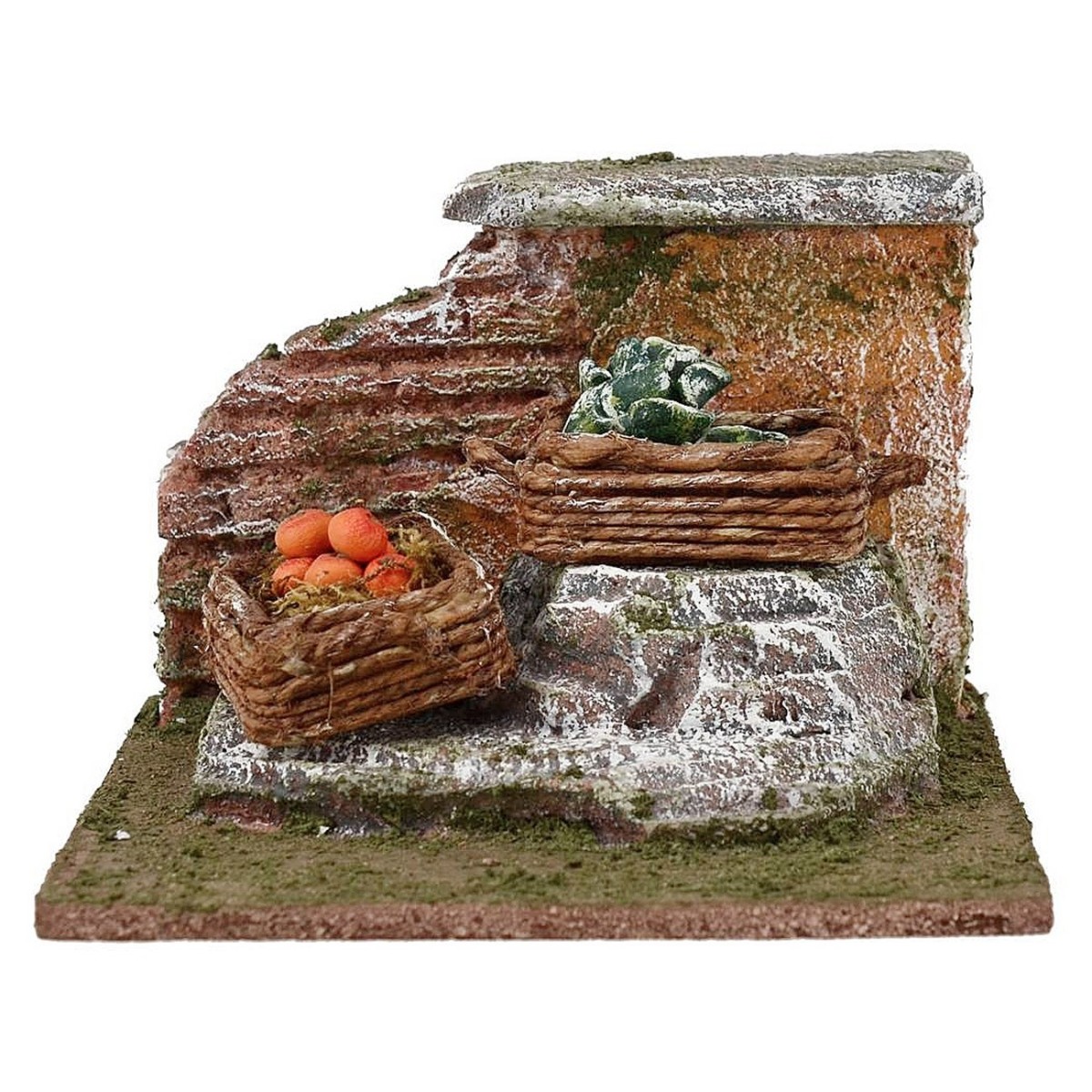 Setting for presepe in classic Popular style with vegetable baskets in the foreground resting on a block of rock and as a backdrop a wrinth of wall. Article artisanal well refinished produced in polystyrene, wood and terracotta, painted by hand and recommended for statues of height 10-12 cm.