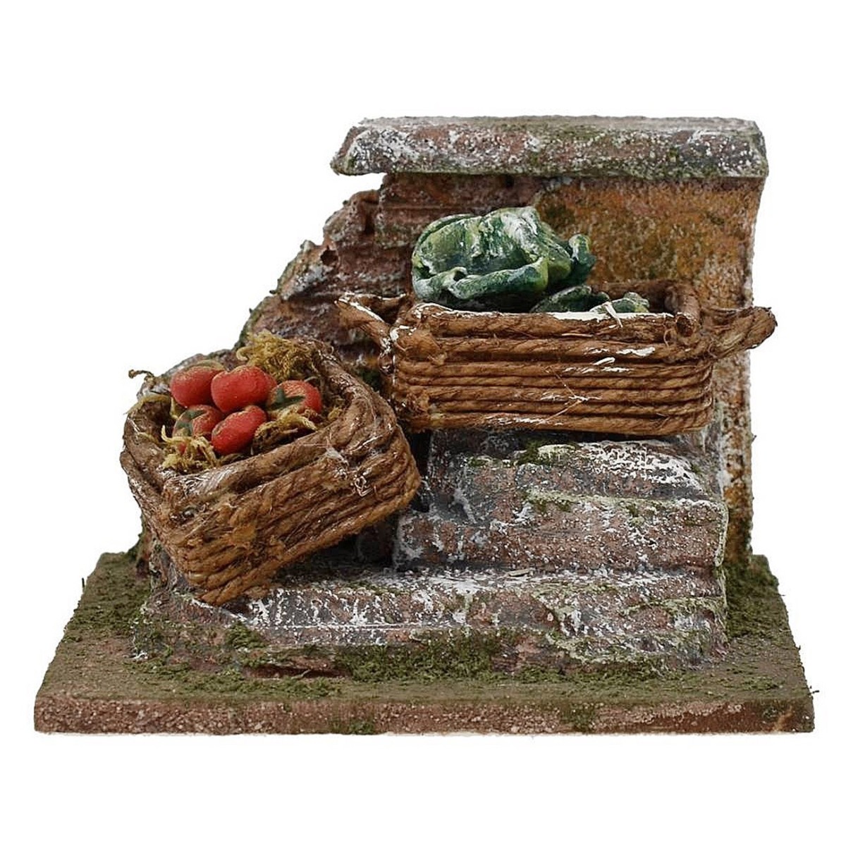 Setting for presepe in classic Popular style with vegetable baskets in the foreground resting on a block of rock and as a backdrop a wrinth of wall. Article artisanal well refinished produced in polystyrene, wood and terracotta, painted by hand and recommended for statues of height 8-10 cm.