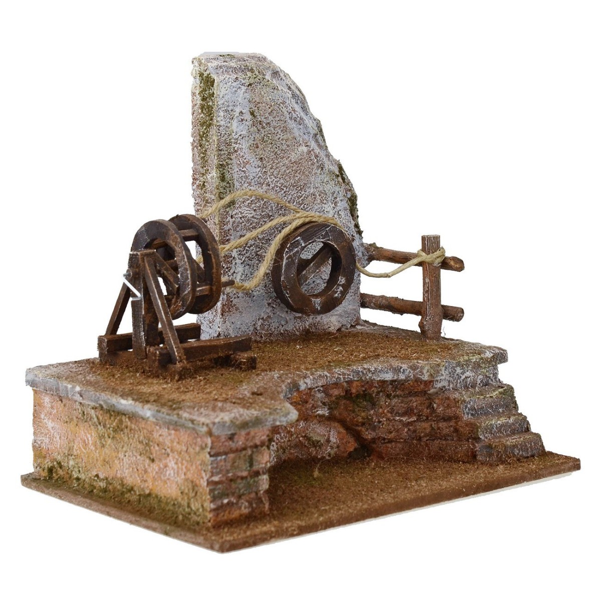 Ruota da funaio (o cordaio) manuale fissata su una base di legno con l'aspo e i filatoi. La macchina si trova un piano rialzato a cui si accede tramite una scaletta in pietra sulla destra; sullo sfondo una bellissima parete di roccia bianca. Questa ambientazione per presepe in stile classico Popolare è prodotta da sapienti mani artigiane italiane in polistirene, legno e sughero. Consigliata per statue di altezza 8-10 cm.