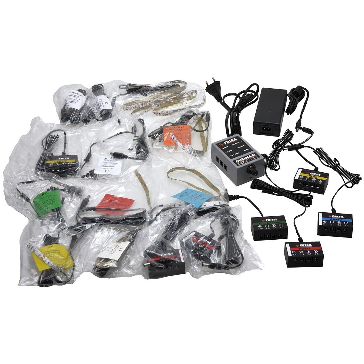 FRIALMAXI, for power and performance, is positioned on a range of semi-professional products. Each output can power up to 15 meters of LED strips or 12V LED spots over 36W (e.g. 5 of our lamps code L7W), corresponding to over 3,000 lumens. The illumination can be compared to that produced by incandescent lamps of more than 300W.