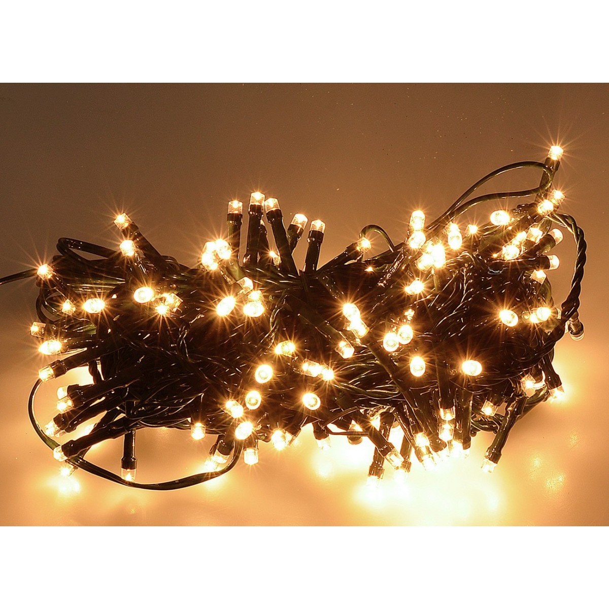 Catena con 180 led bianco caldo lunga 14 metri, è adatta sia per ambienti interni che per l'esterno. Ogni led ha una distanza di 5cm ed completa con giochi d luce.