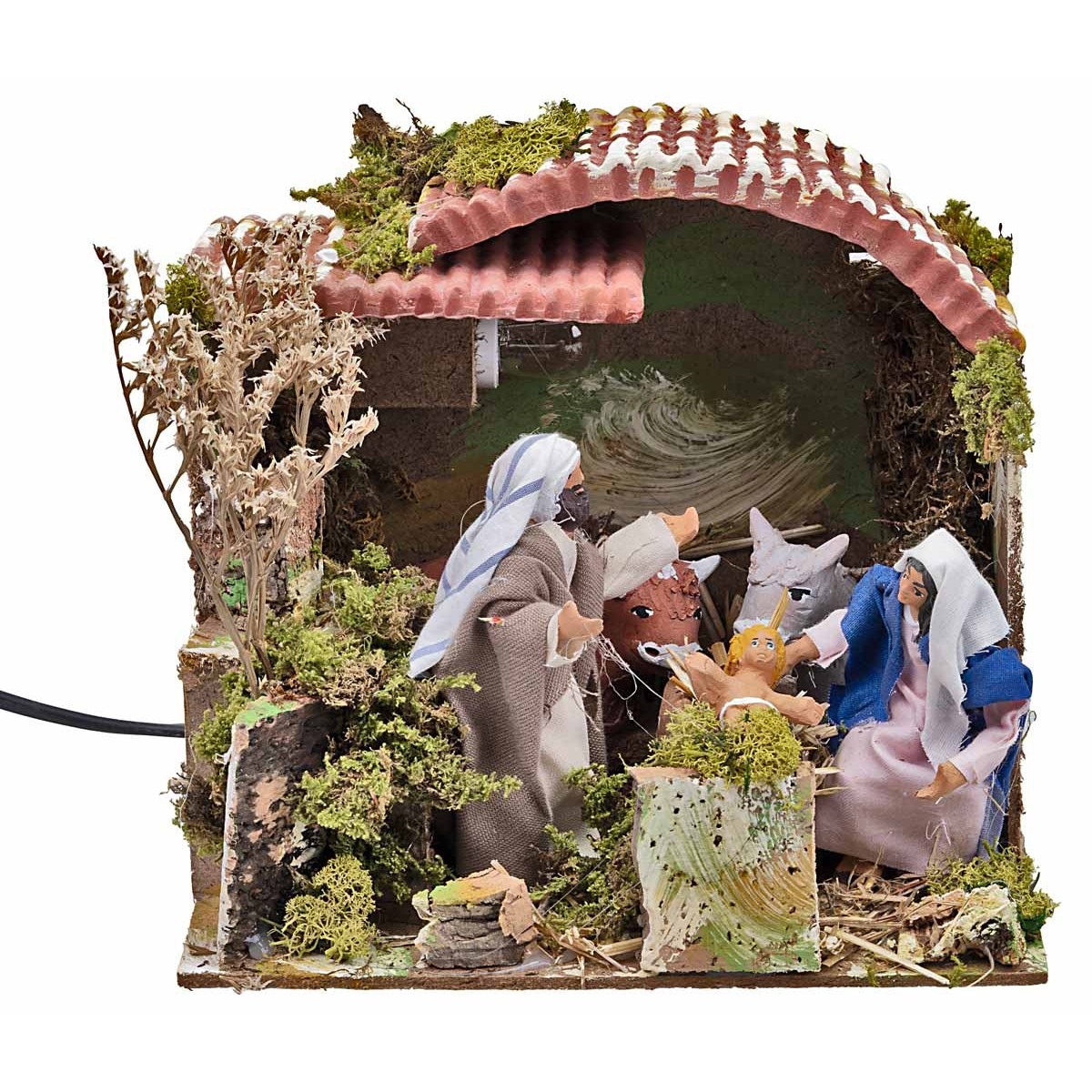 Illuminated hut with Nativity in motion powered by electricity. Mary cradles Baby Jesus by moving her arm, while Joseph approaches the son with a movement of his torso. The hut also includes the donkey and the ox in terracotta. The figurines are made of terracotta and hand-painted in Italy, dressed in fabric clothes. Please note that the colors of the product may vary as it is handcrafted. Measures: Width: 23 cm Depth: 18 cm Maximum height: 19 cm Statue height: 11.5 cm Materials: Various Power supply: Electricity