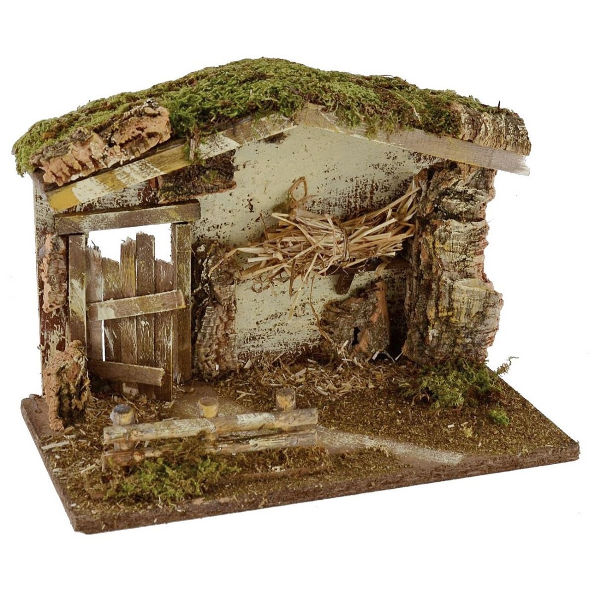 Capanna made artisanally in Italy by savvy hands craftsman using wood, cork and musk. The scenography is characterized by a hut delineated by the triangular roof and the surrounding vegetation greenery. Inside the hut we can notice a fence, an open semi-open wooden portoncine and a straw fascin leaning on a wooden shelf. In related products it is possible to detect Nativity statues of recommended height from 10 to 12 cm.