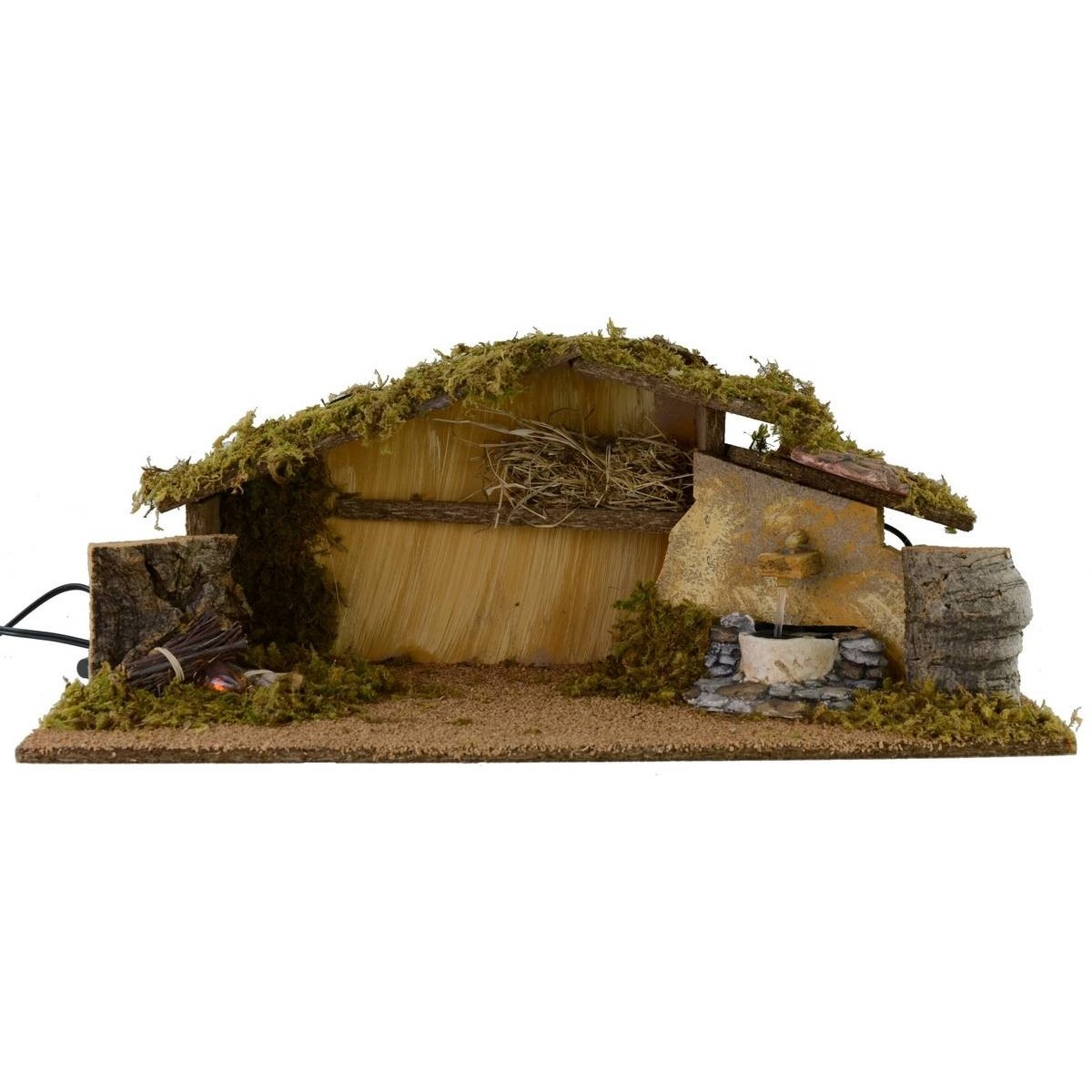 Capanna artigianale con fuoco e fontana funzionanti a corrente. La scenografia è caratterizzata da una capanna delineata dal tetto triangolare rifinito con coppi in terracotta e dalla verde vegetazione circostante. All'interno della capanna possiamo notare una grande fascina di paglia e del muschio tutt'intorno. A completare la suggestività del prodotto troviamo una fontana funzionante a riciclo d'acqua continuo e un fuoco funzionante. Si consiglia di abbinare alla seguente capanna statue di Natività di altezza 8-10 cm, in base ai propri gusti e preferenze, alcune delle quali visionabili nei prodotti correlati. Prodotto realizzato interamente in Italia da sapienti mani artigiane, utilizzando legno, sughero, muschio e terracotta.