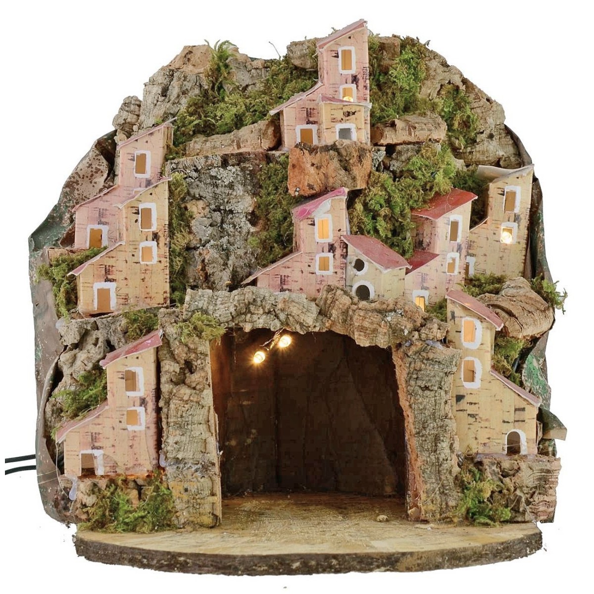 Illuminated nativity scene with village and cave. The scenography is well finished: on the lower floor there is a cave, where it will be possible to place nativity statues with a recommended height of 6 h cm according to your tastes and preferences, some of which can be viewed in related products. On the upper floor, on the other hand, a village develops, made up of small houses perched on the mountainside, which gives an important remoteness effect. The warm white lights, running on current, which illuminate the landscape, give a suggestive atmosphere. Furthermore, the use of moss and bark makes the landscape very realistic, as it is adorned with green vegetation and surrounding rocky walls. The product is handcrafted in wood, cork and moss.