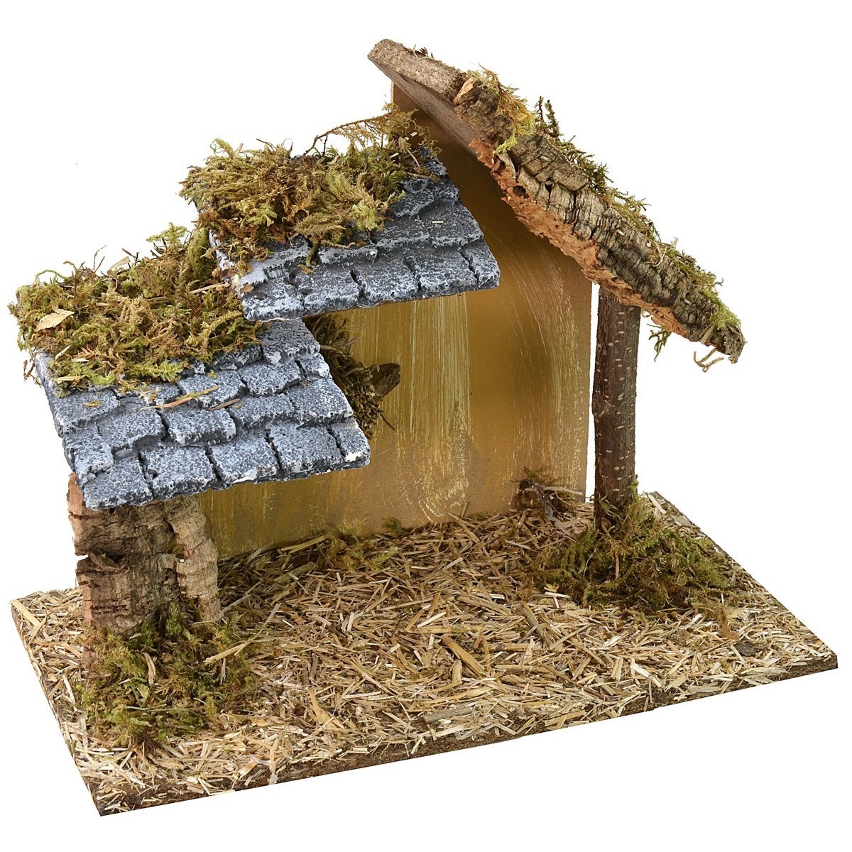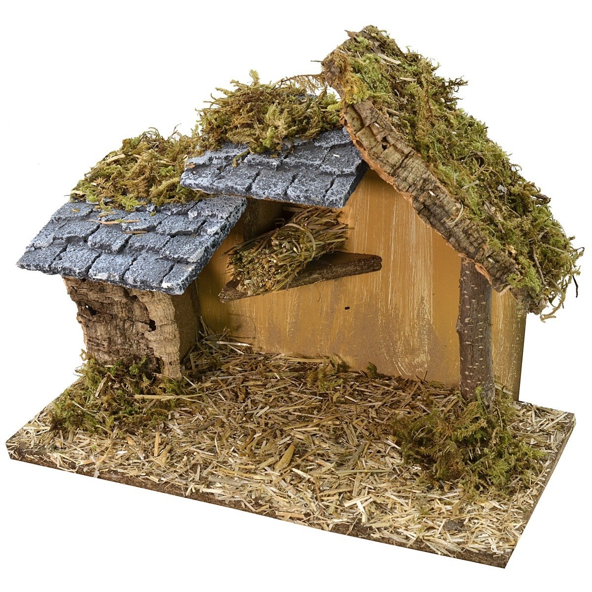 Capanna con soppalco sul quale è posizionata della paglia. Il tetto della capanna è ricoperto di muschio che è presente anche in altre parti dell'ambientazione mentre il pavimento è coperto di paglia. Sono consigliate statuine dall'altezza cm 10 presenti nella categoria del sito 'statue presepe' ed è possibile illuminare l'ambientazione con apposite luci presenti nella categoria 'illuminazione presepe' del sito. L'articolo è stato prodotto in legno sughero e muschio.