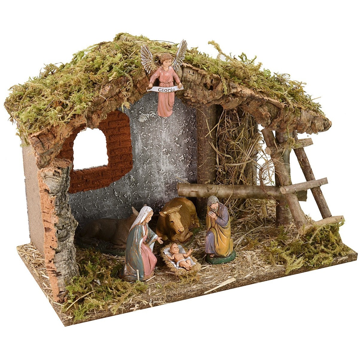 Complete hut of Nativity series Landi Moranduzzo 10 cm, handcrafted in wood, cork and moss. Inside the structure there is a large window with red bricks, while on the right a wooden staircase and a large manger with hay. The straw bed is warm and welcoming for the animals. In related products you can find some suggestions. To give greater importance to the hut it will be possible to illuminate it, everything necessary for your needs is already available in the "LIGHTING" category, you could, for example, insert a chain of 10 or 20 LED lights in the current version or batteries; alternatively a single current-operated bulb or low voltage lanterns / lights.