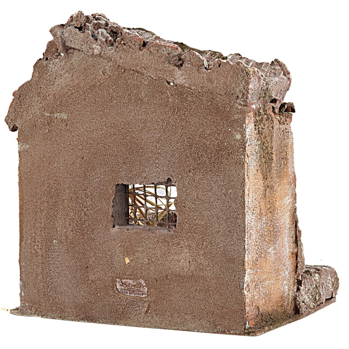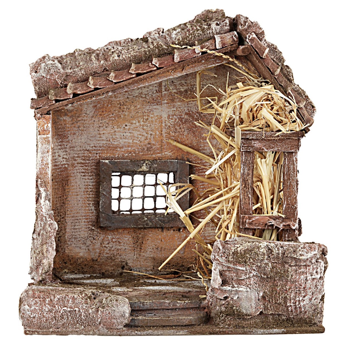 Capanna per presepe a cui si accede salendo un paio di scalini, a destra una grande mangiatoia colma di fieno e sul retro una finestrella quadrata. Il tetto spiovente dona dinamicità alla scena realizzata da artigiani italiani con legno, sughero e polistirene. Questo articolo è consigliato per statuine di altezza 10 cm disponibili nei prodotti correlati sotto la tabella e si precisa che informazioni più dettagliate sulle figure da abbinare si trovano nella sezione dettagli prodotto.