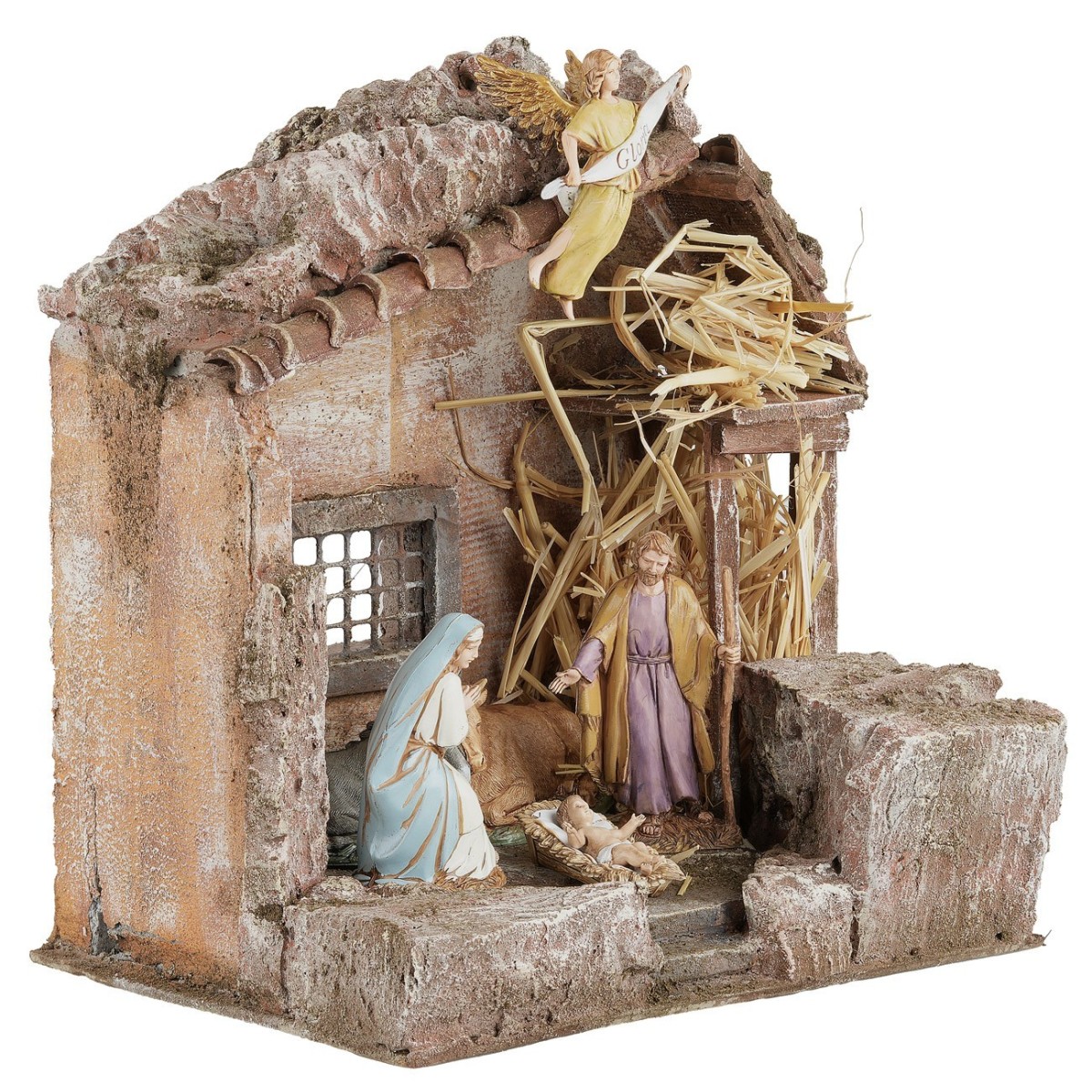 The scene depicts a rustic hut with a sloping roof that gives movement and dynamism to the structure. On the right side, there is a large manger filled with hay that enriches the stable's setting, while in the background there is a small square window that adds depth to the scenery.