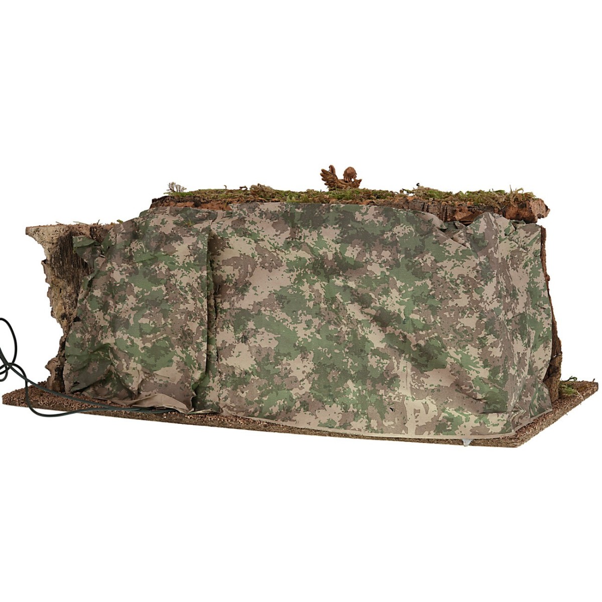 Illuminated hut powered by electricity, housing the Nativity from the Landi Moranduzzo series, 10 cm tall, actually 9 cm. On the left, there is a manger with hay, while on the right, there is a fenced sheepfold. The item will always be supplied with the same number of characters shown in the photo, but it should be noted that the subjects may change depending on availability. The item is handcrafted in Italy using wood, cork, and moss. Measures: - Base: 53.5x25 cm - Hut height: 20 cm - Internal height: 16.5 cm - Series statues: 10 cm Landi Moranduzzo - Material: Wood - cork - moss