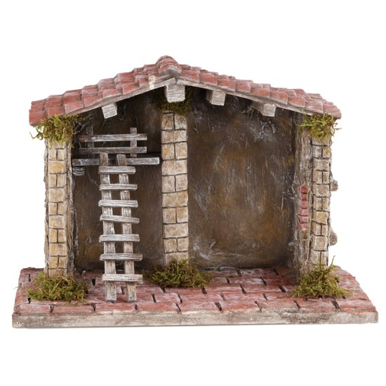 Nativity scene hut of excellent craftsmanship finished in the finest details: the walls are made of bricks with raised stucco, the ceiling features exposed wooden beams covered by a roof of tiles arranged precisely. The red flooring is also crafted with such skill that you can easily perceive the thickness of each tile. In the upper left, there is a wooden bed accessible by a movable ladder, while on the right, there is a large window. This hut is perfect to host a Nativity set of 10 cm in height available in related products below the table. The item was made in Italy by the best craftsmen with wood, polystyrene, and moss.