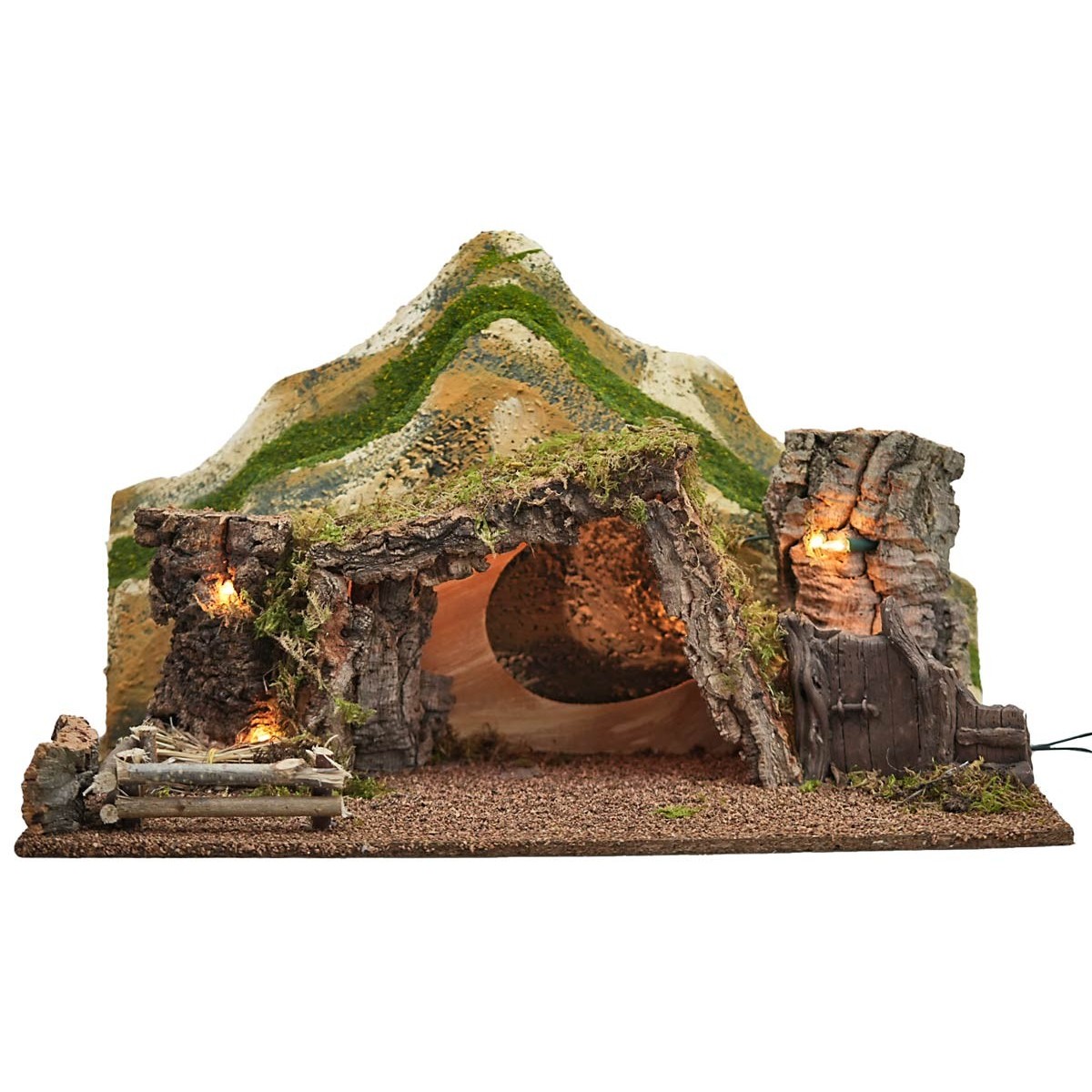 Wooden hut with electric lighting. In the background, there is a setting representing a mountainous landscape, making the nativity scene more immersive and realistic. Statues from the Landi Moranduzzo 10 cm series are recommended, although their actual height is 8.50 cm. The product is handmade in Italy, so it may show differences from the photographs.