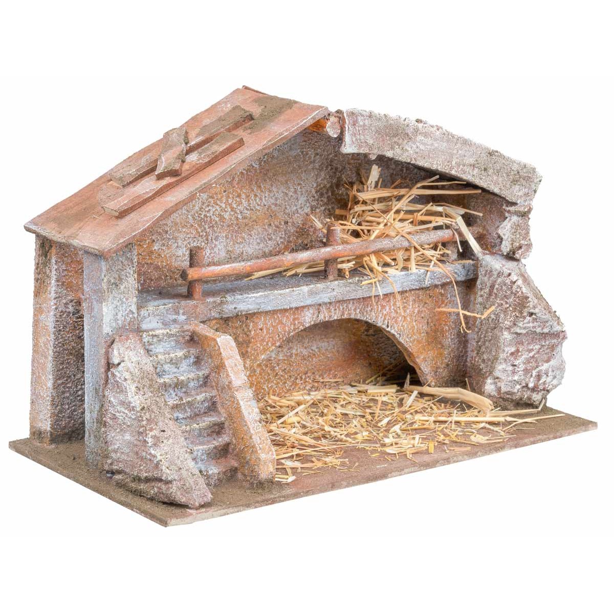 The structure features an enclosed loft and an arch, with a staircase on the left to access the upper floor. Embellished with straw for a realistic and rustic look, it is made by Italian craftsmen in polystyrene and wood.
