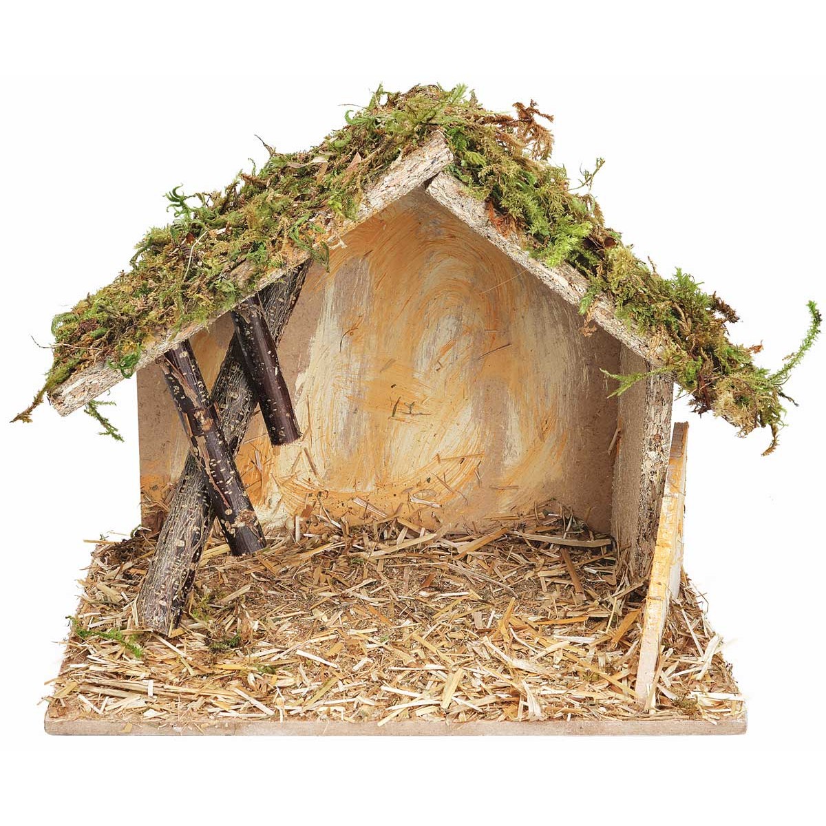 Empty hut recommended for figurines 8 cm high, with open structure at the front and sloping roof finished with natural cork and moss.