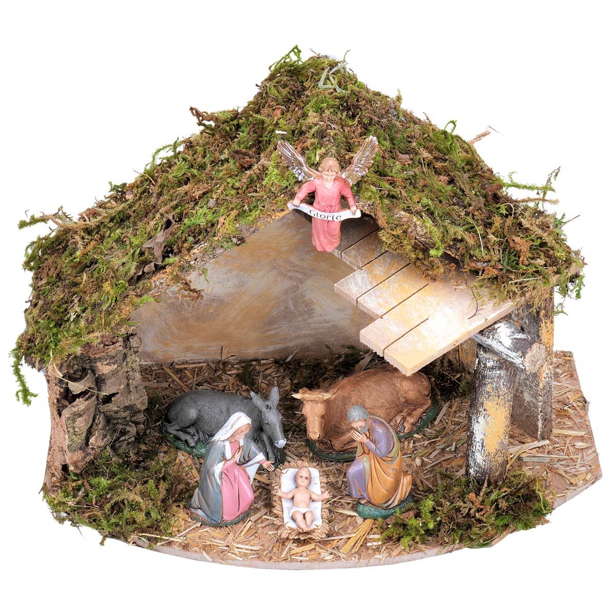 The setting features an open-fronted structure with natural cork and moss covering, creating a balanced and well-proportioned scene for the representation of the Nativity.
