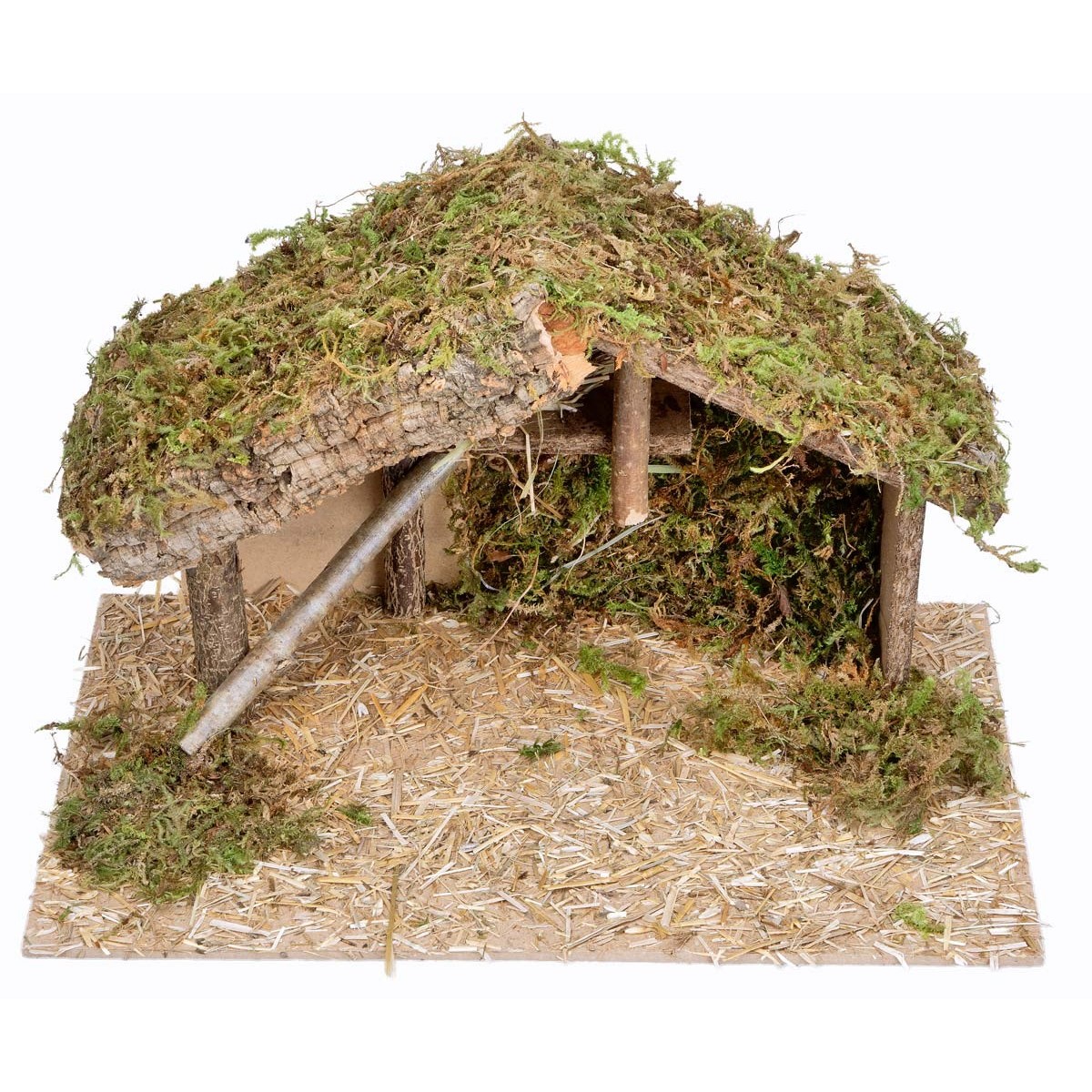 Inside there is a suspended beam supporting an upper platform with resting straw, while the back is enriched with moss applied to the wall.