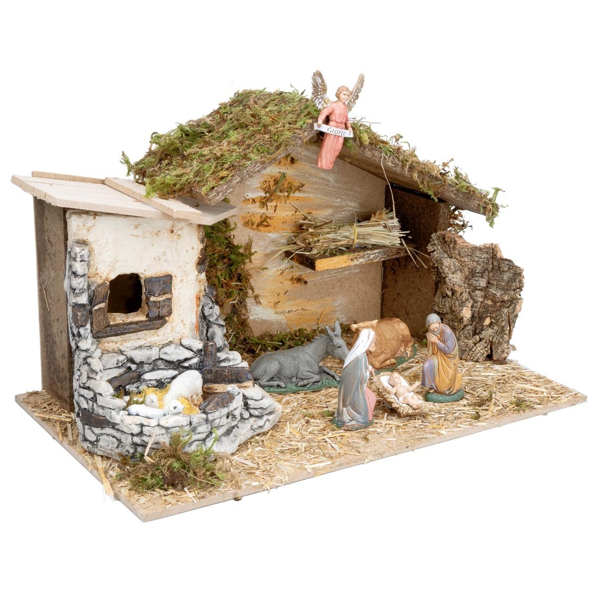 Hut with sloping roof and structure with side storage, complete with 6-subject nativity of the Landi Moranduzzo 10 cm series.