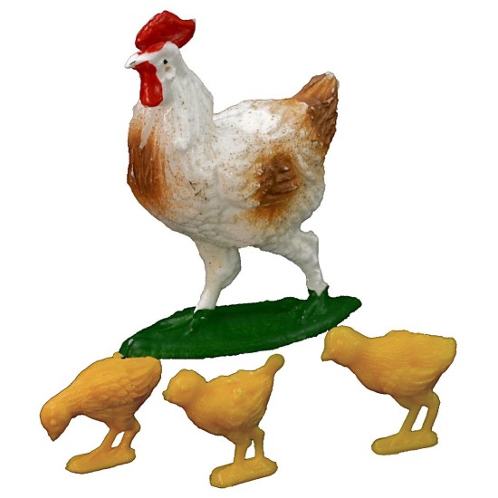 Famiglia di animali da cortile serie Oliver composta da gallina e tre pulcini, consigliati per statue di altezza 10 cm.