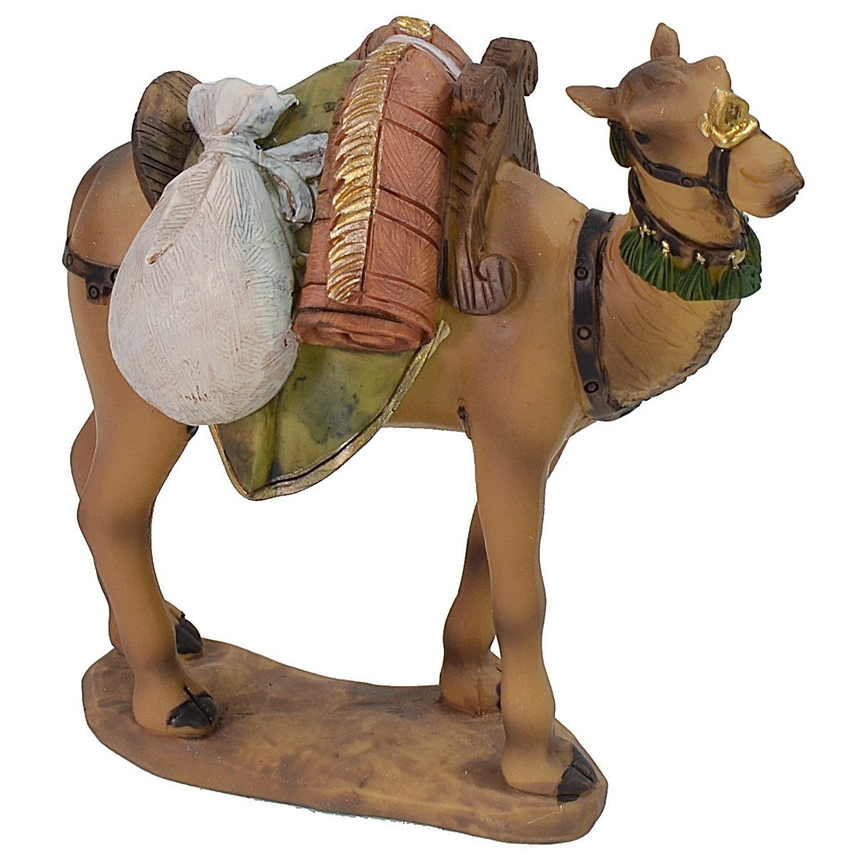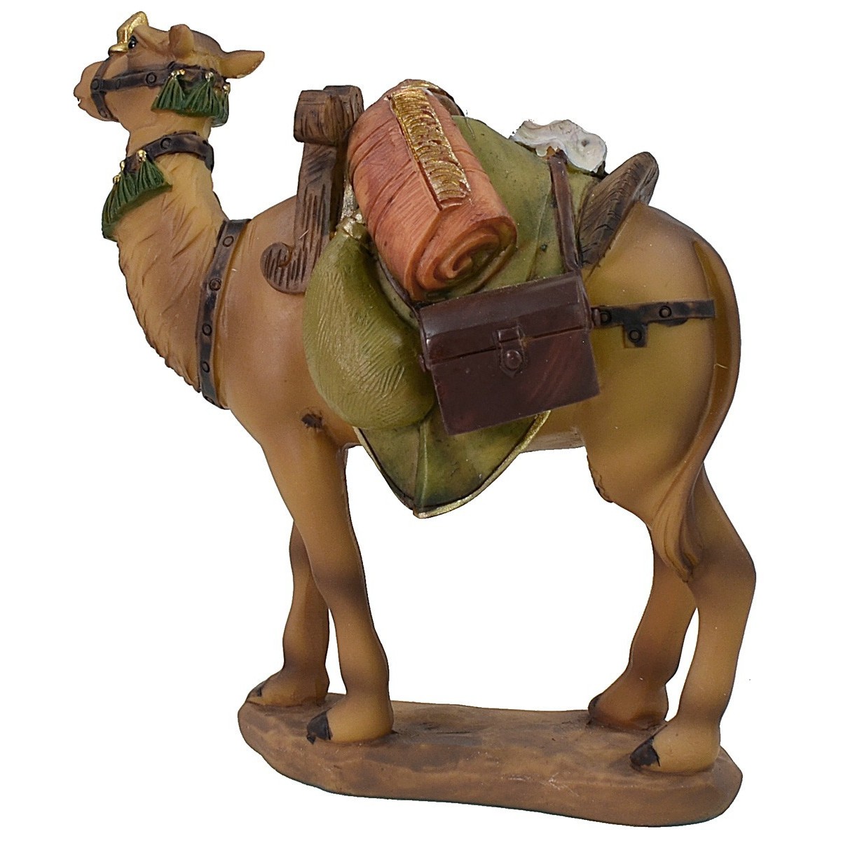 Elegant humped camel covered with a saddle loaded with objects such as drapes and water bottles. The article is embellished with golden decorations and is recommended for 10 cm tall statues.