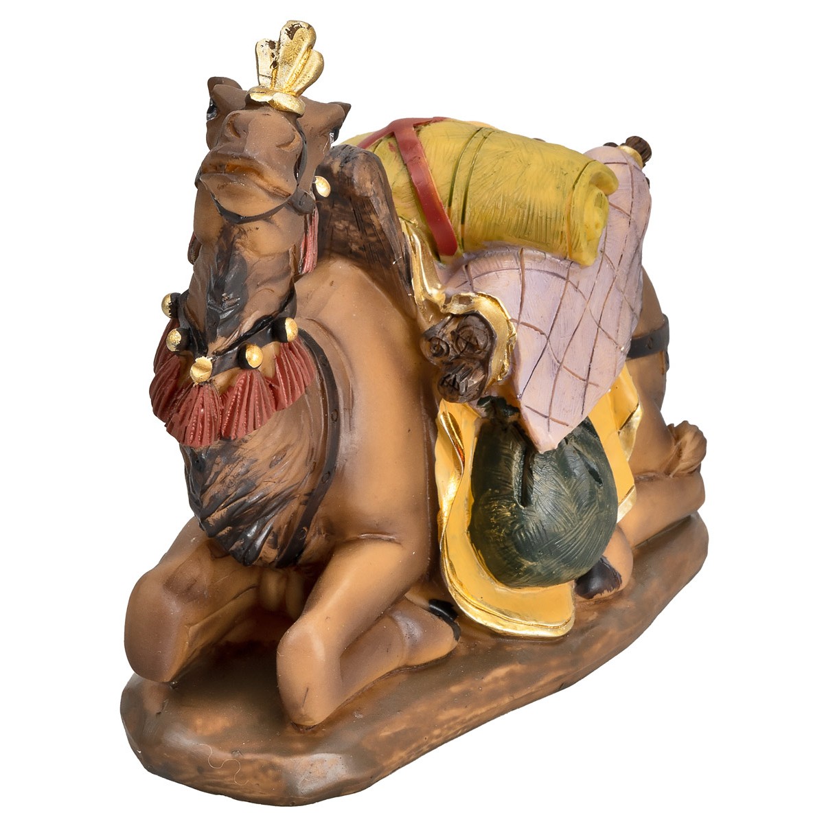 The statue depicts a camel in a reclining position, richly decorated with colorful trappings and miniature accessories like bags, rugs, and rolls loaded on its back. The collected pose and the detailing of finishes make the figure particularly realistic and scenic.