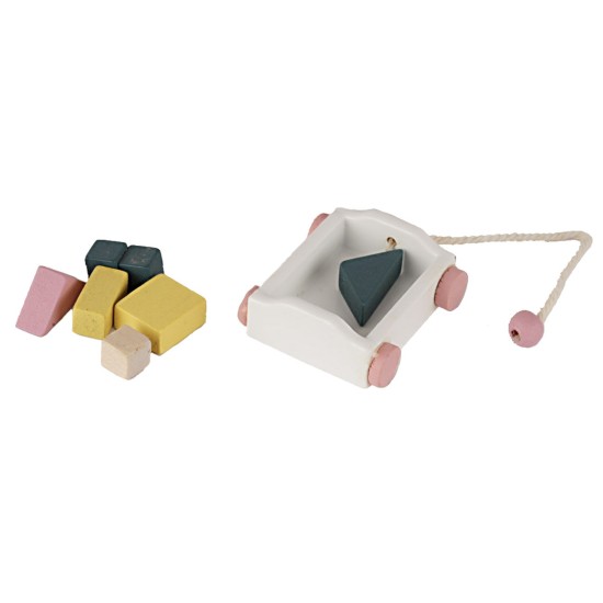 Children's toy cart with 7 small wooden pieces of different shapes and colors. Suitable for figurines with a height of 12-15 cm.