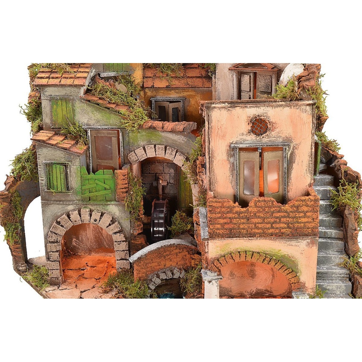 Borgo artigianale illuminato in stile napoletano, caratterizzato da un mulino in movimento funzionante a corrente. La scenografia si presenta ben rifinita nei dettagli: al piano inferiore è presente un'area dove sarà possibile collocare statue di Natività di altezza consigliata 8-10 cm in base ai propri gusti e preferenze, alcune delle quali visionabili nei prodotti correlati. Si trova inoltre un mulino ad acqua funzionante a corrente e una scalinata che porta al piano superiore dove sono collocate alcune abitazioni e una chiesa. Regalano un'atmosfera suggestiva le luci, già presenti nell'articolo, attraverso le quali è possibile illuminare la scena. Inoltre, l'utilizzo del muschio e della corteccia rende il paesaggio molto realistico, in quanto fitto di verde vegetazione e pareti rocciose circostanti. Articolo realizzato interamente in Italia da sapienti mani artigiane, utilizzando il sughero, il legno ed il muschio.
