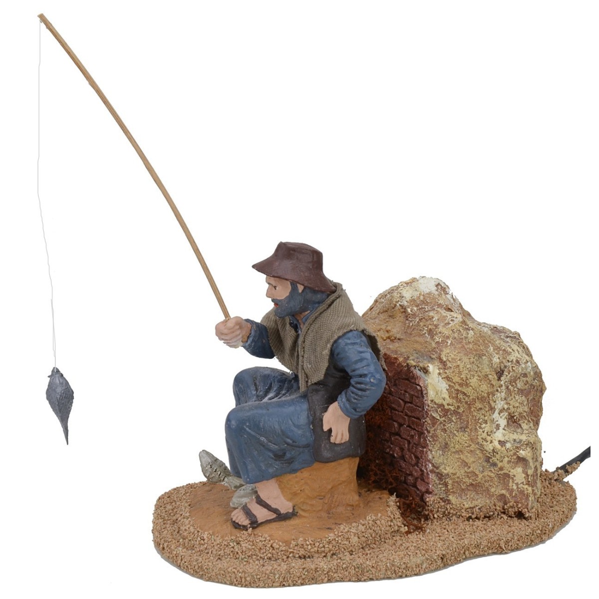 Seated man raising and lowering his 15cm series fishing rod in motion. The scene is completed with a rock-shaped engine cover and a bucket full of fish. The statue has an expressive face, each piece is made entirely by hand by Italian artisans therefore the colors and clothes may vary. The article is working on electricity.
