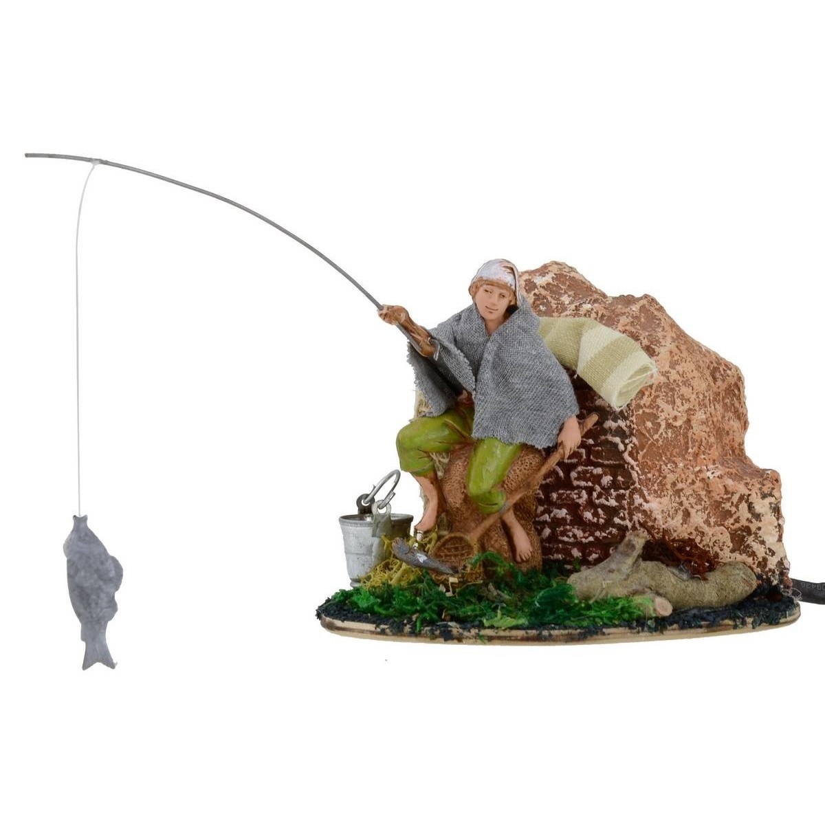 Fisherman with cane in motion fishing series 10 cm Landi Moranduzzo. Statue for Presepe carried out in Italy, well finished in the details with cloak in fabric and very expressive face. The rock on which the fisherman is seated is carried out in resin painted by hand.