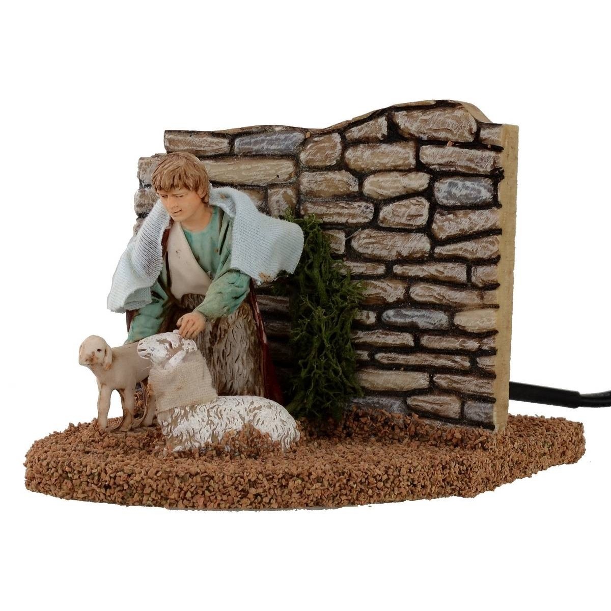 Pastore chino con pecora e agnello, la scena presenta un doppio movimento, funzionante a corrente. Il pastore muove il suo braccio sinistro accarezzando la pecora che abbassa il capo. La scena è stata realizzata in Italia da sapienti mani artigiane, e la statua risulta ben rifinita in resina con scialle in tessuto. Questa ambientazione ha come sfondo una parete di mattoni irregolari in pietra e della vegetazione verde su di essa. Ricordiamo che la statua fa parte della serie Landi Moranduzzo 10 cm, ma la sua altezza reale in ginocchio e di circa 7 cm.