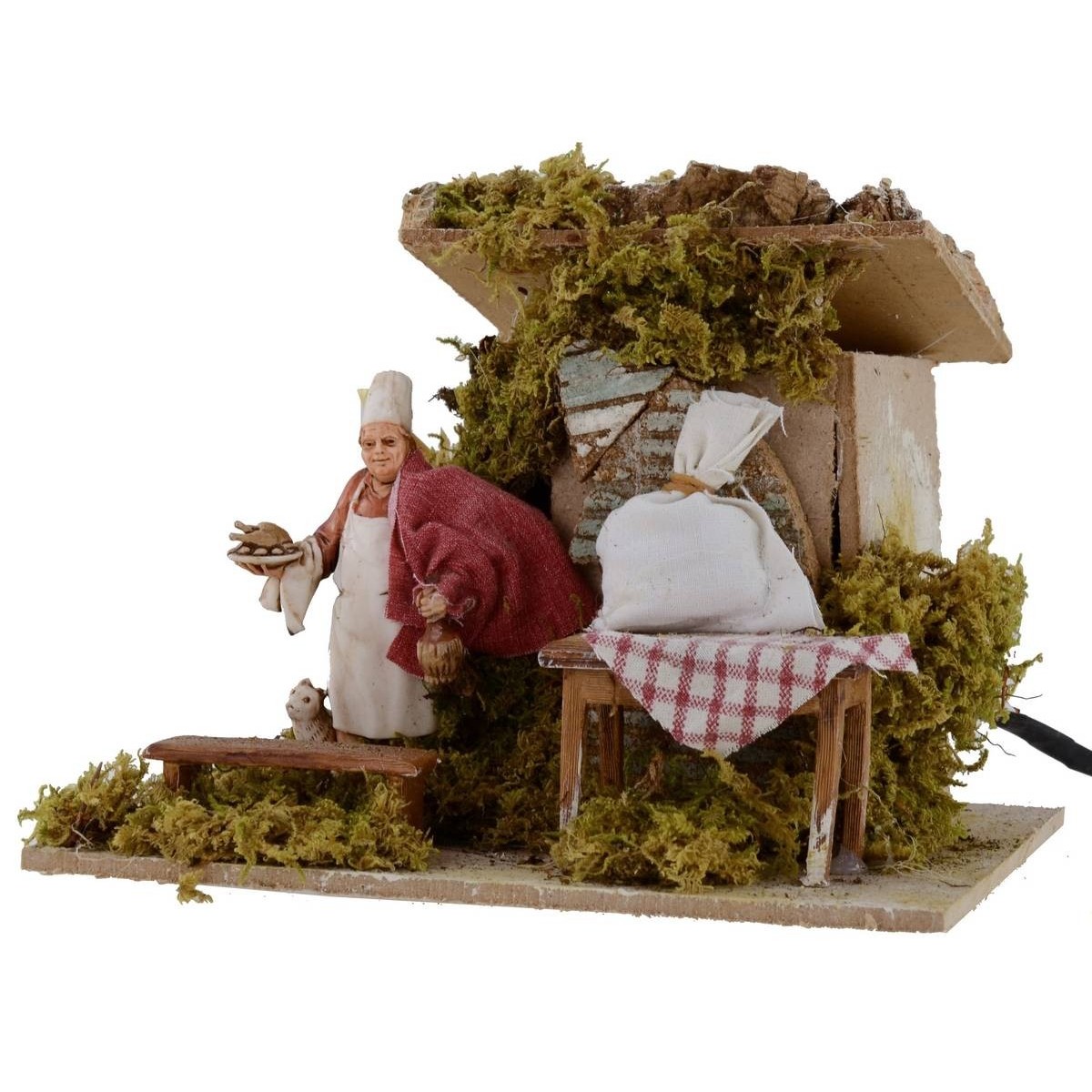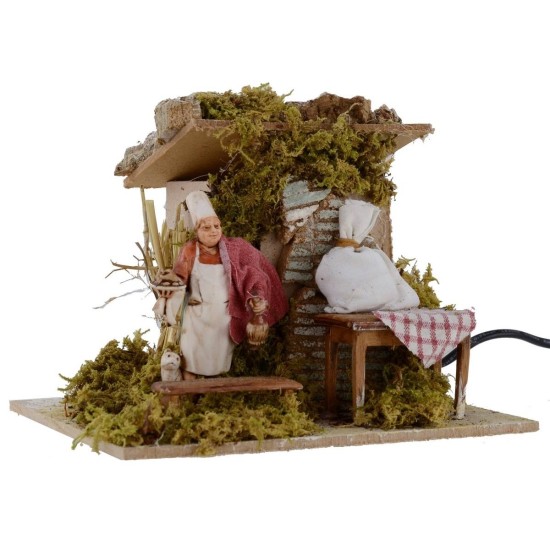 Cuoco Landi Moranduzzo with fiasco in hand in motion, functioning at current. The man moves his left arm up by raising and lowering the fiasco. This setting is rich in vegetation greenery and a rustic shop located behind the cook. Other characteristic elements of the scene are : a cat at the foot of the cook, a straw fascin, a panca and a table on which a white bag is placed and a cadre tablecloth. The scene represents the cook intent on serving the ready dish and the wine fiasco. The statue has been carried out in Italy by savvy artisan hands and is well over in detail. It has a height of about 10 cm and is part of the Landi Moranduzzo series of the same size.