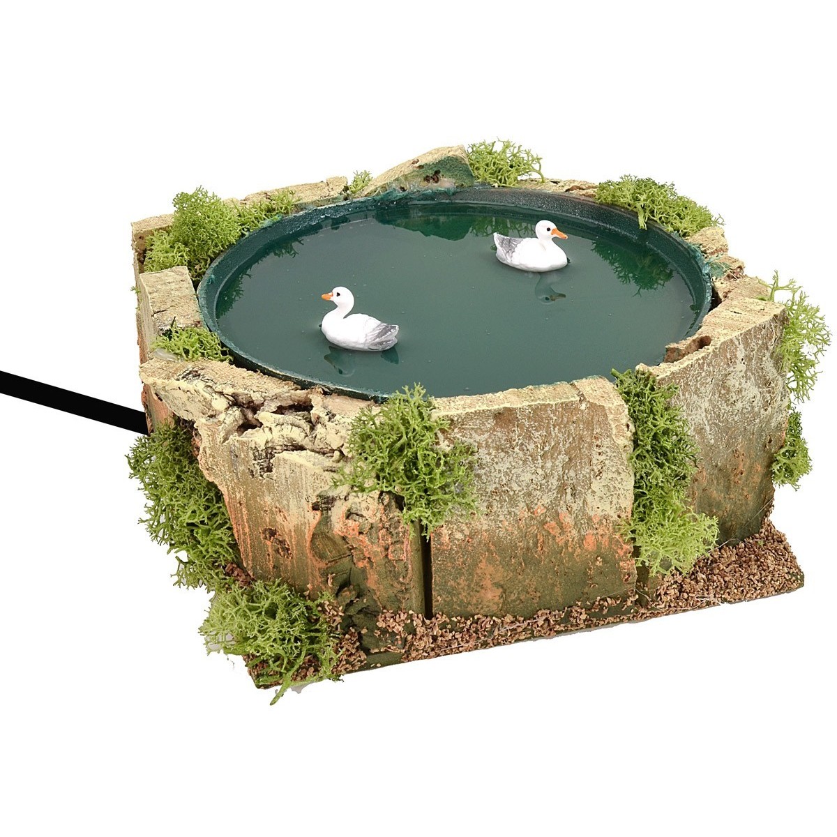 Stagno con due oche in movimento realizzato in Italia. L'articolo è molto piacevole e rifinito con pareti in sughero e muschio, per renderlo ancora più realistico c'è la possibilità di aggiungere un filo d'acqua alla vaschetta anche se il moto è funzionante a corrente.