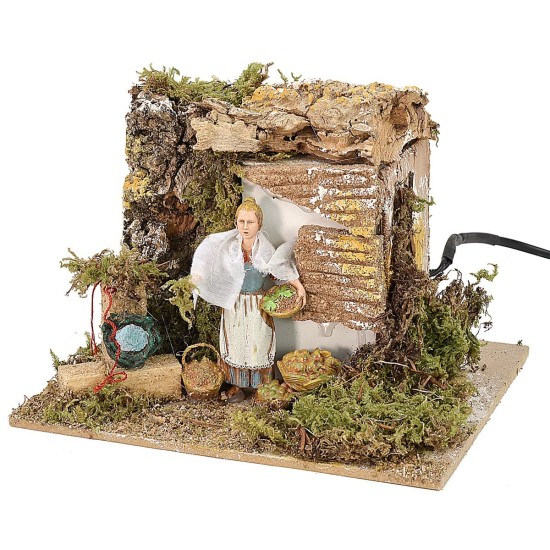 Ortolana serie Landi Moranduzzo serie 10 cm in movimento. La donna muove il braccio con la verdura che ha tra le mani per proporre ai clienti. La statua è stata realizzata in Italia da sapienti mani artigiane e risulta ben rifinita nei dettagli. Essa ha un'altezza reale di circa 8,5 cm e fa parte della serie Landi Moranduzzo da 10 cm, il pordotto è funzionante a corrente.