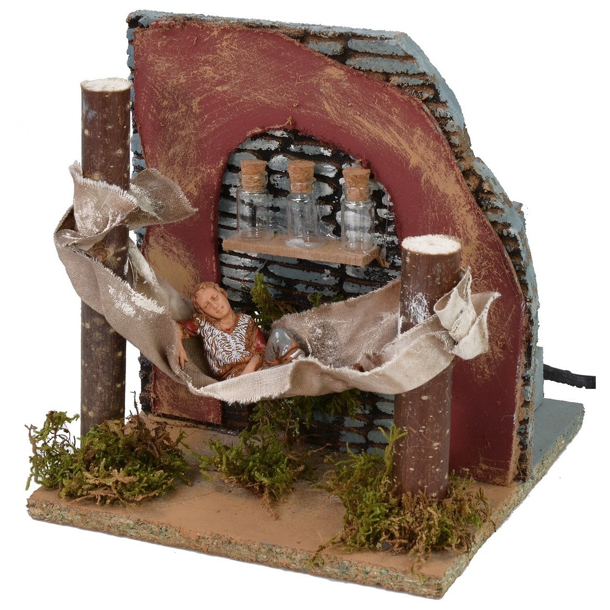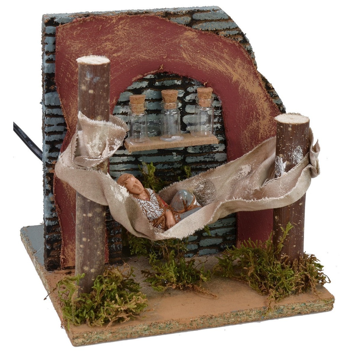L'ambientazione rappresenta un uomo che si dondola sull'amaca realizzata in stoffa annodata a due pali in legno. Sulla parete principale vi è una mensola sui cui sono collocate tre piccole bottiglie trasparenti con dei tappi in sughero e il tutto è abbellito dal muschio. Il prodotto è alimentato a corrente e fa parte della serie 10 cm Landi Moranduzzo in movimento.