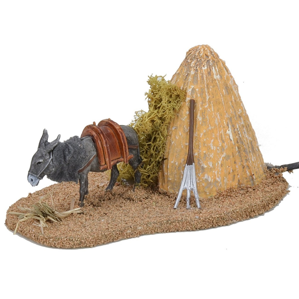Asino serie 10 cm Landi Moranduzzo in movimento che alza e abbassa il capo per mangiare il fieno. La scena è completata di covone e un attrezzo da campagna. L'articolo è realizzato interamente a mano ed è funzionante a corrente.