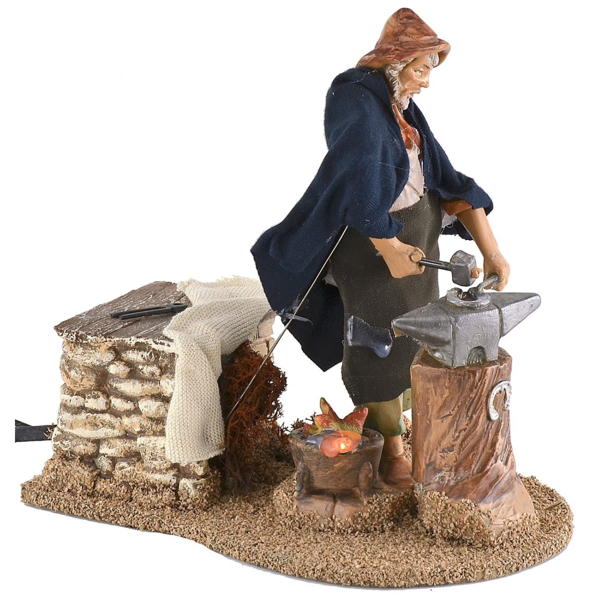 Moving nativity craftsman who, by raising and lowering his arm, simulates the action of forging the horseshoe with the hammer he holds, next to his feet there is a brazier with flame effect light. The statue is part of the Fontanini 19 cm series, it is finished with a fabric cape and behind it there is a resin and lichen structure to cover the mains-operated motor part.