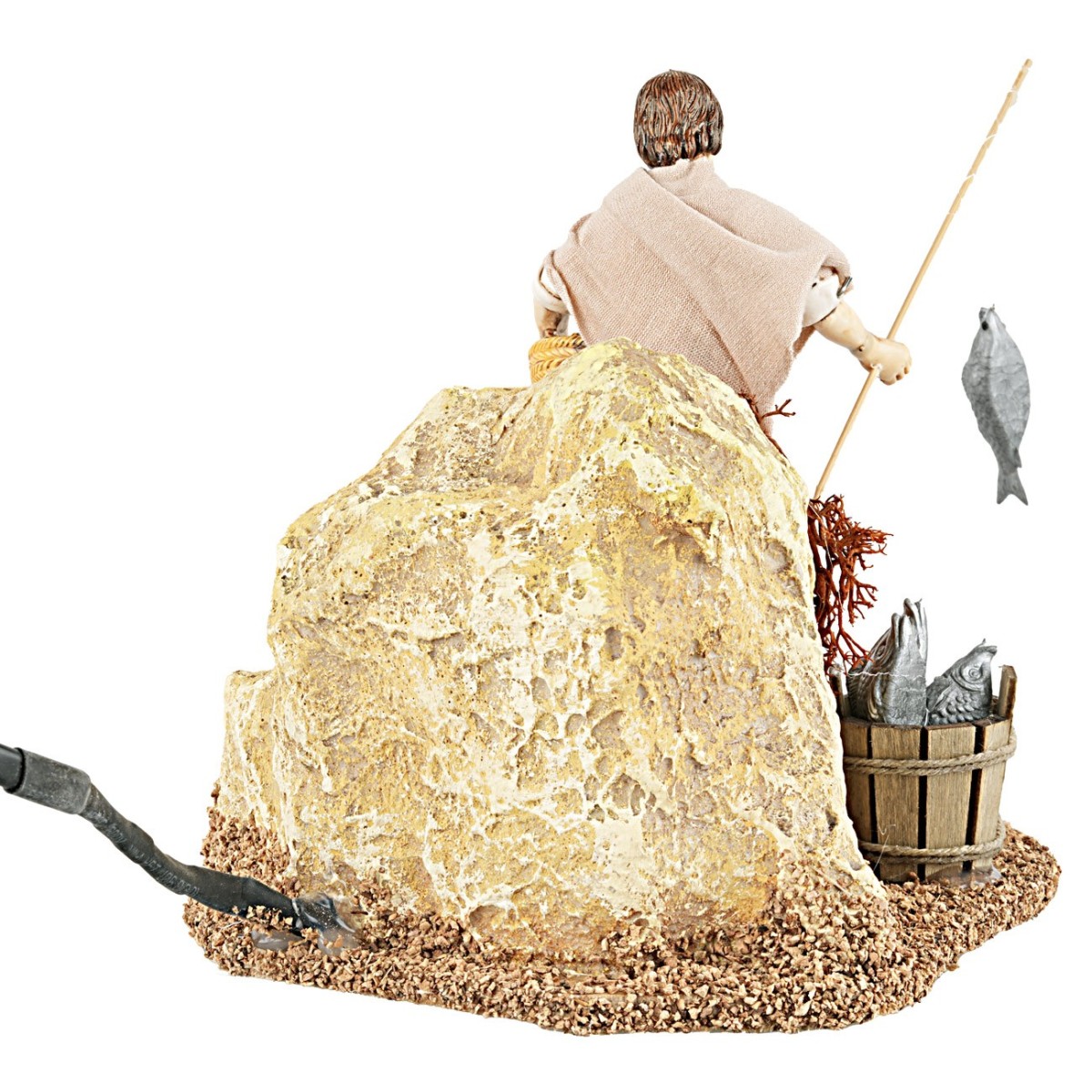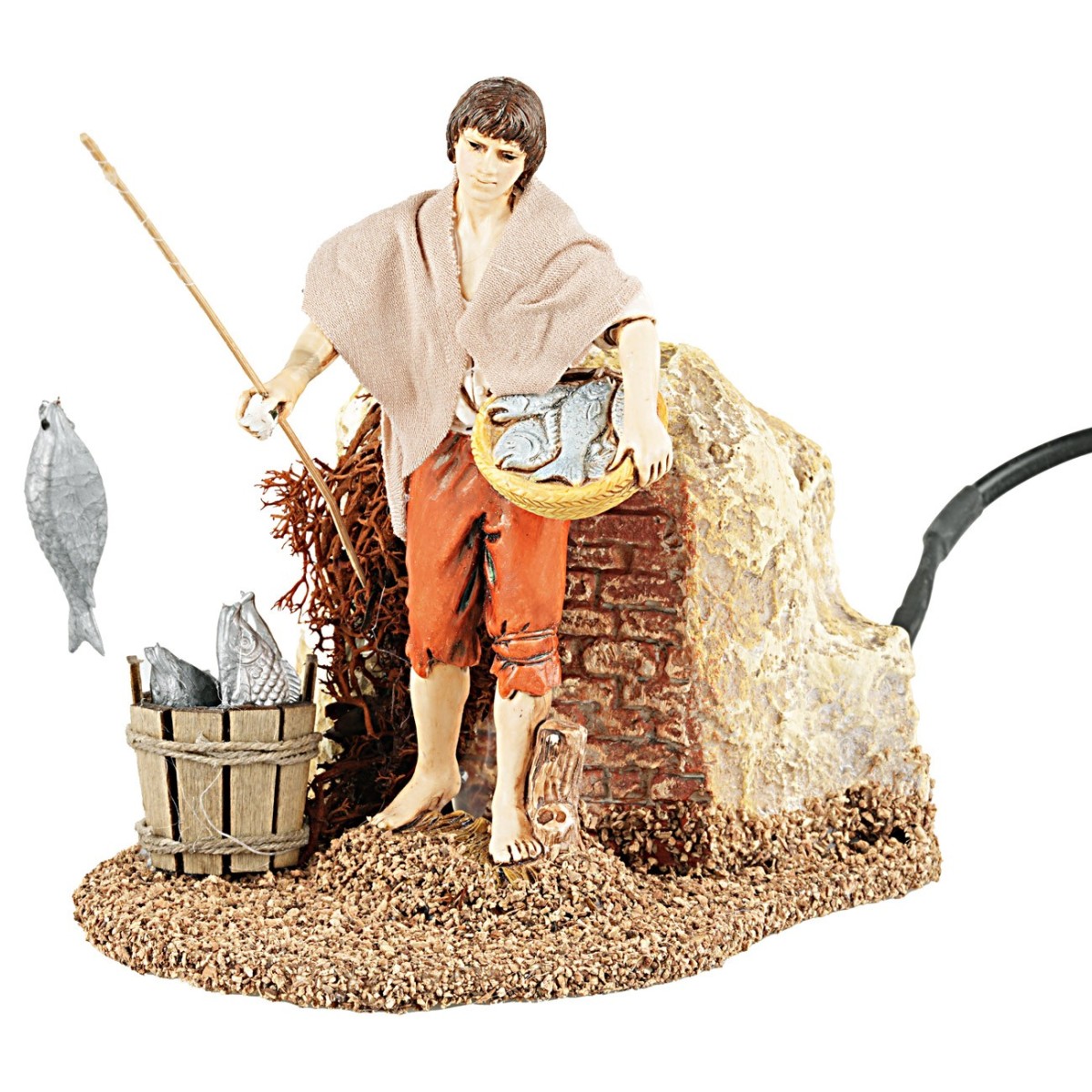 Man who, with the movement of his arm, simulates the action of fishing. The statue is part of the 12 cm Landi series and is finished with a fabric cloak. The setting for the nativity scene is enriched by a bucket full of fish and a rock behind the fisherman. It is made of wood, cork, moss and resin and operates on electricity.