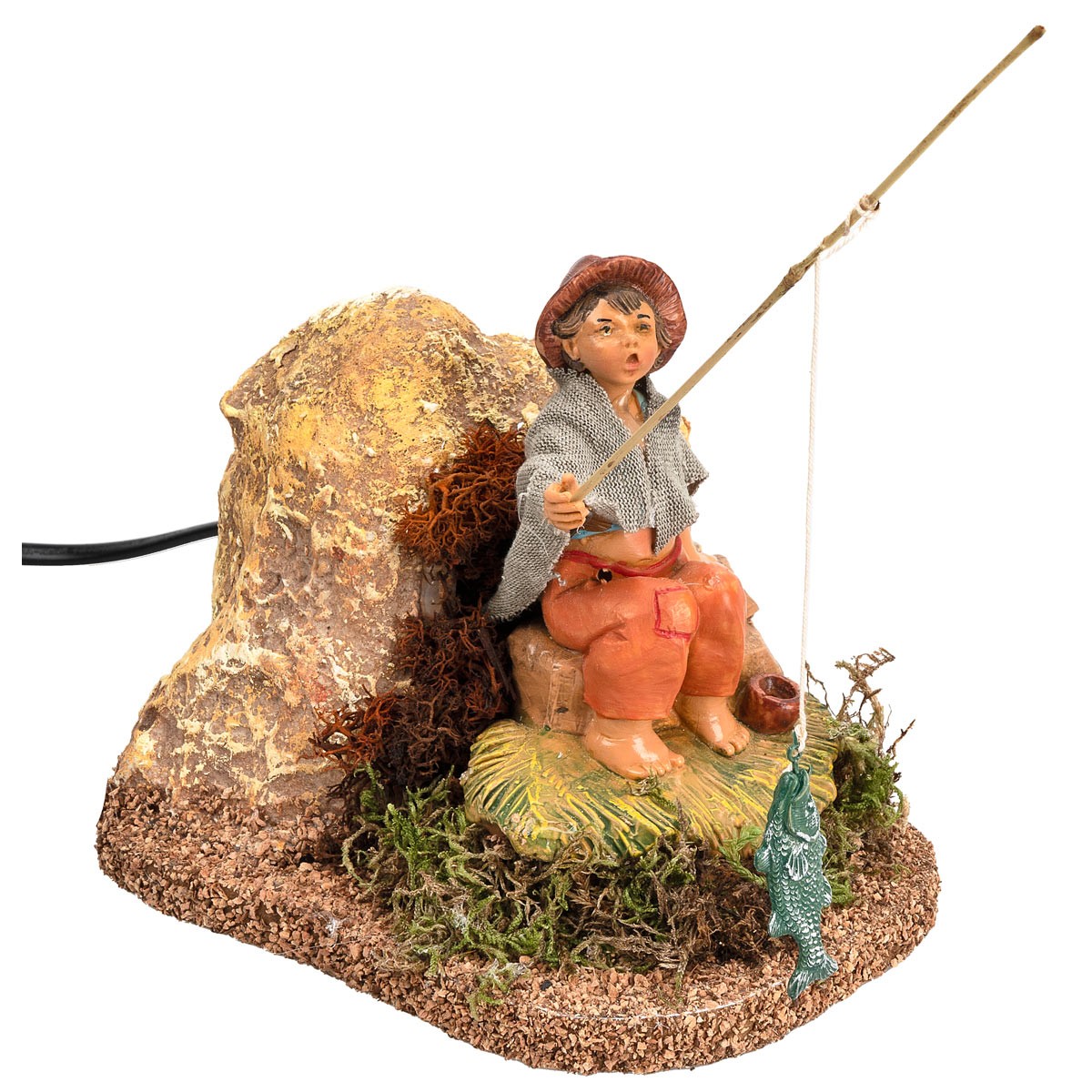 Child in motion from the Fontanini 12 cm series, depicted while grabbing the rod with the arm simulating the action of fishing.