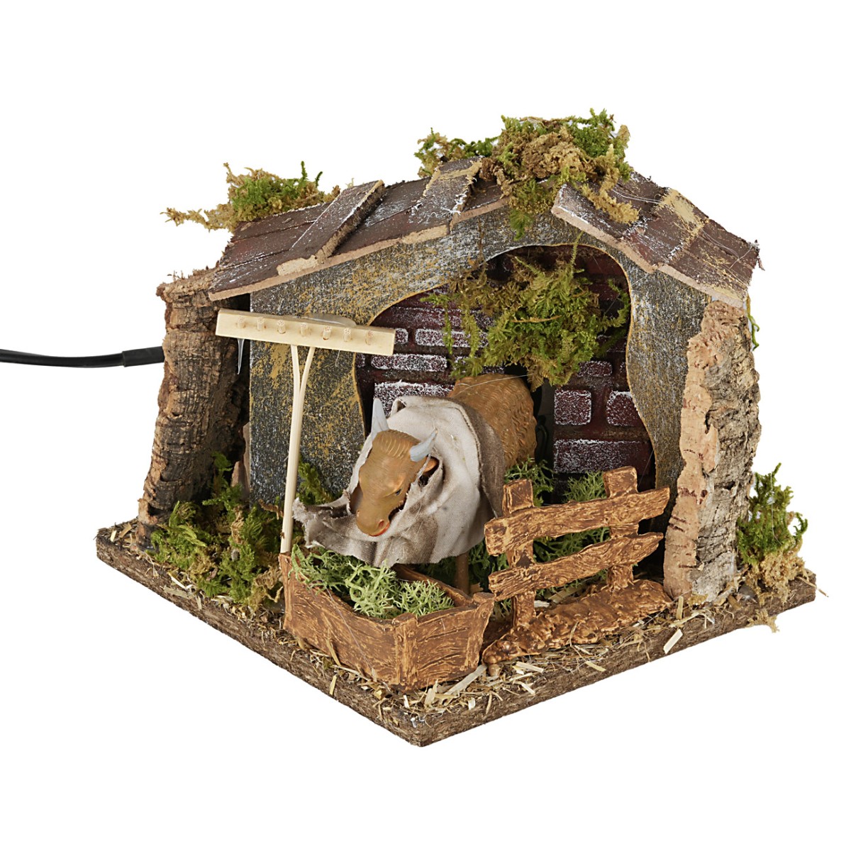 The scene depicts a moving ox feeding from a bowl. It is surrounded by a fence on the right and a light wood rake on the left. In the background, a brick house facade with a sloping roof, enclosed by a brushed wood structure. The whole is enriched with green moss. The ox lowers and raises its head to eat. This figure for classic or Neapolitan nativity scenes is made in PVC and works with electricity. Each piece may vary in details, being handcrafted in Italy with natural materials like wood, cork, and moss.