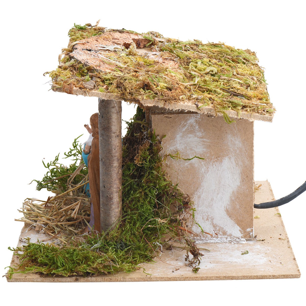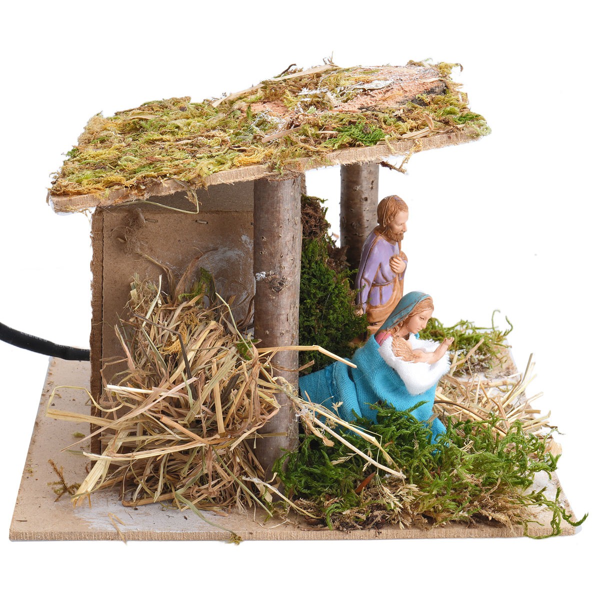 The setting is inside a simple hut with a wooden structure, with a base enriched by moss and straw, designed to recreate a traditional and intimate Nativity scene.