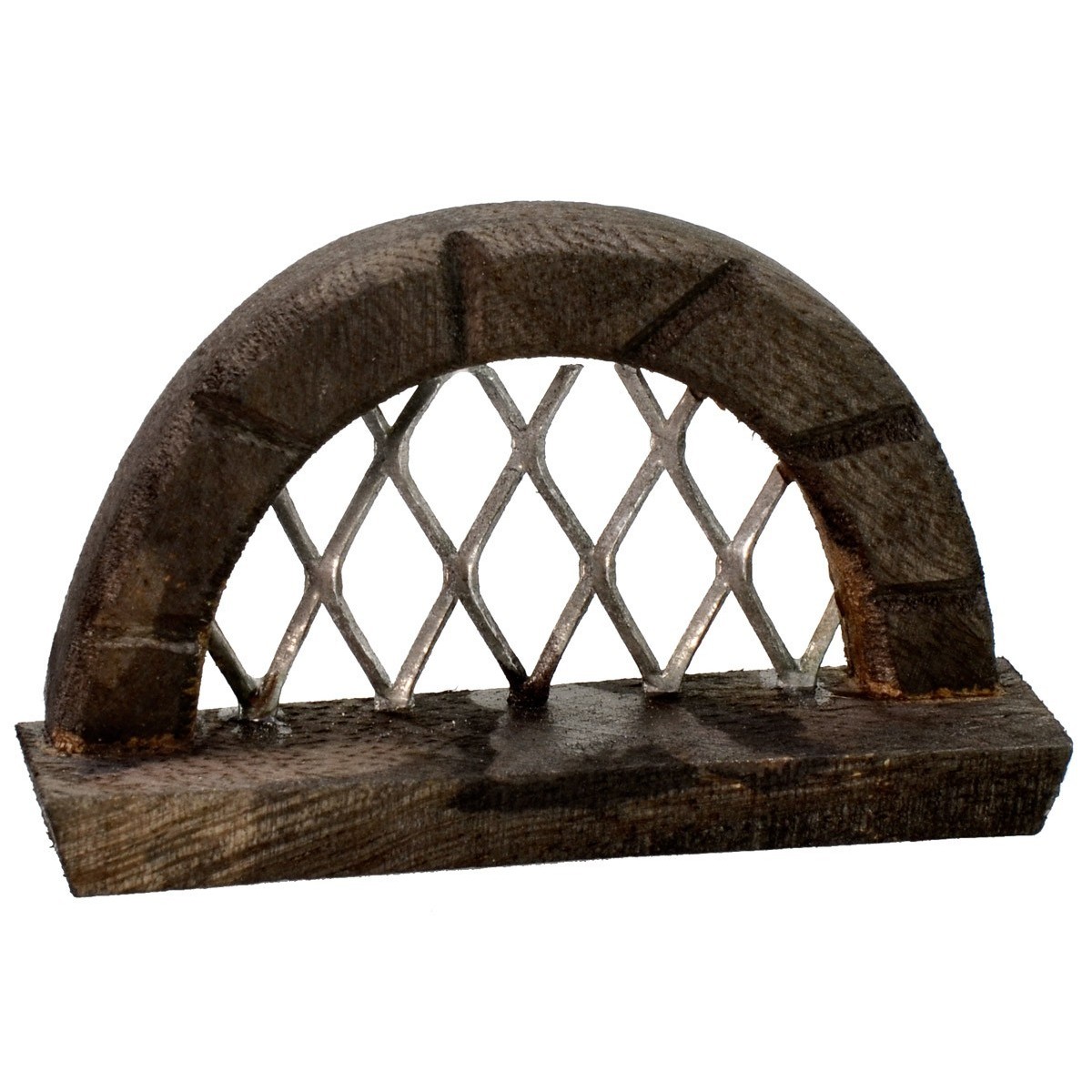 Arched window made of dark wood, with a metal grid fixed inside the structure.