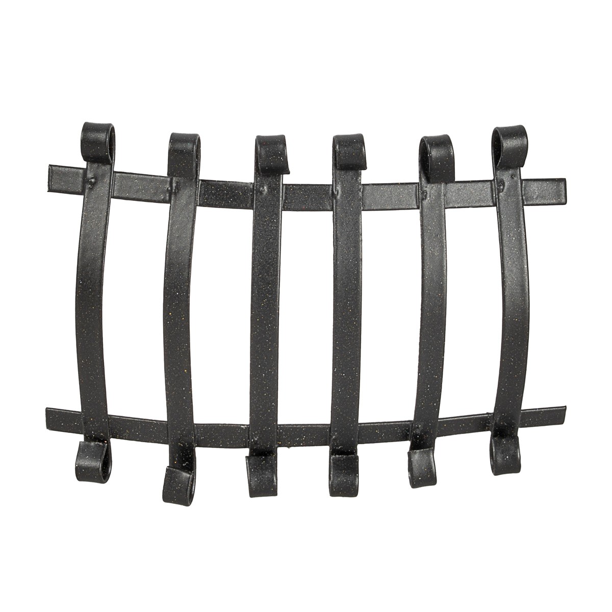 Black metal railing for nativity scene, available in two sizes. The element is made with curved vertical bars and ring ends, ideal for placement as protection for balconies, terraces, or loggias in nativity scene settings.