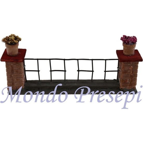 Railing with pillars and vases with flowers.