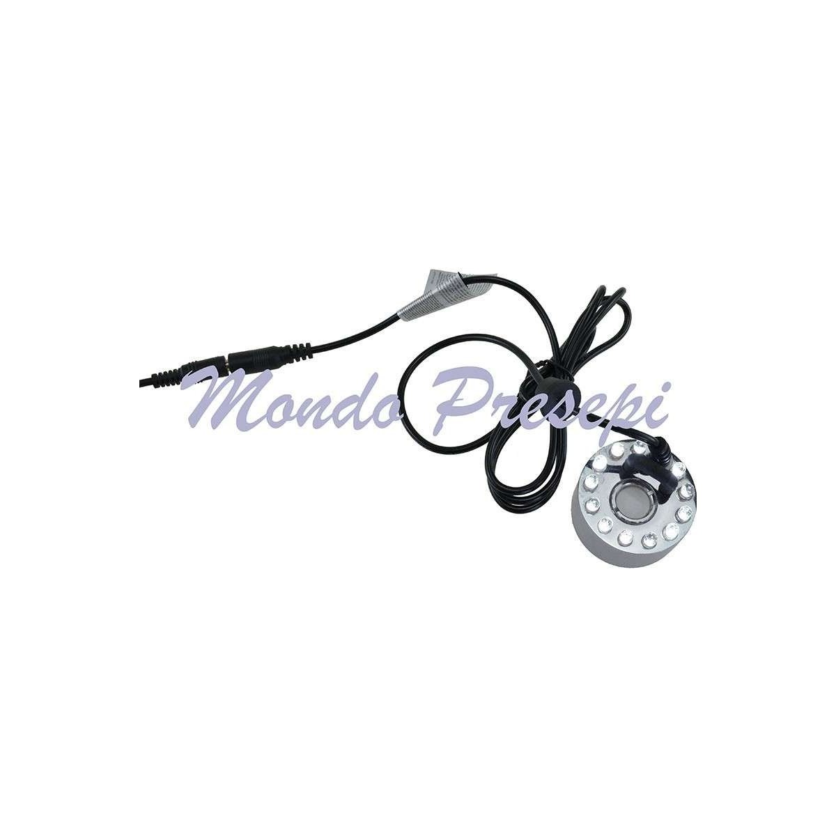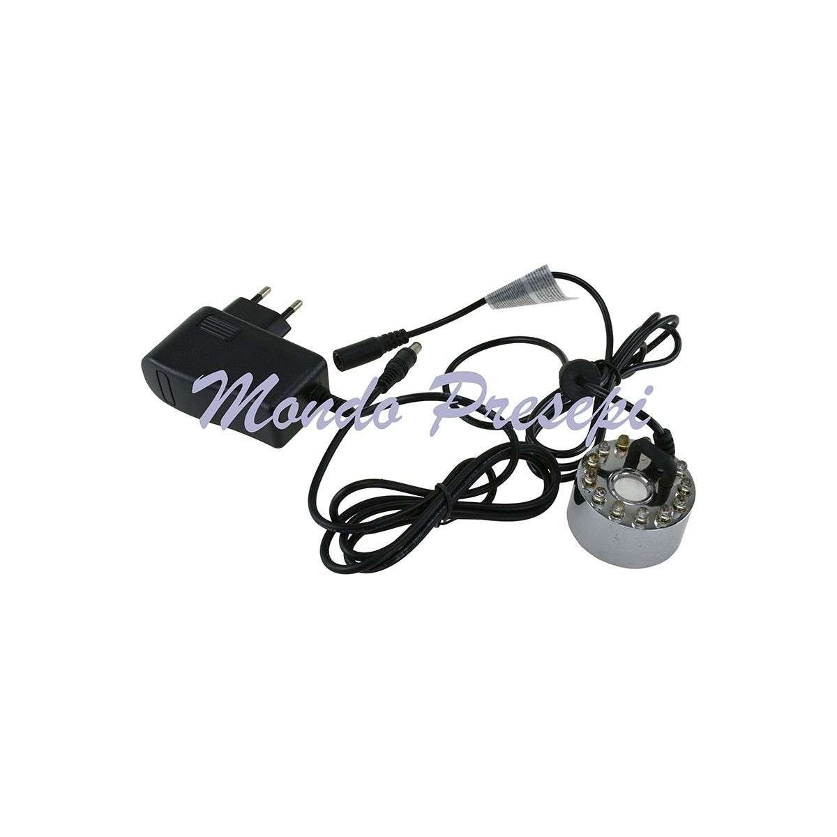 Nebulizer with LED, white cool light, equipped with transformer. It is recommended for creating fog and mist effects near ponds or streams. To achieve this, simply immerse the terminal part of the device in a container of water. Note that the water should be about 4 cm deep, without exceeding or falling short, otherwise the effect will not work.