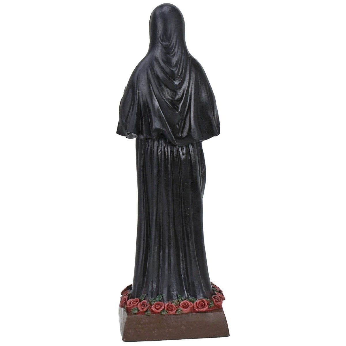 20 cm high, well finished and hand painted resin statue depicting Saint Rita of Cascia. The nun wears the classic black dress of the Augustinian order and holds a crucifix with red roses in her hands. On the base on which it stands the name is engraved and other roses are placed in a circular direction, this flower is one of the symbols of Santa Rita.